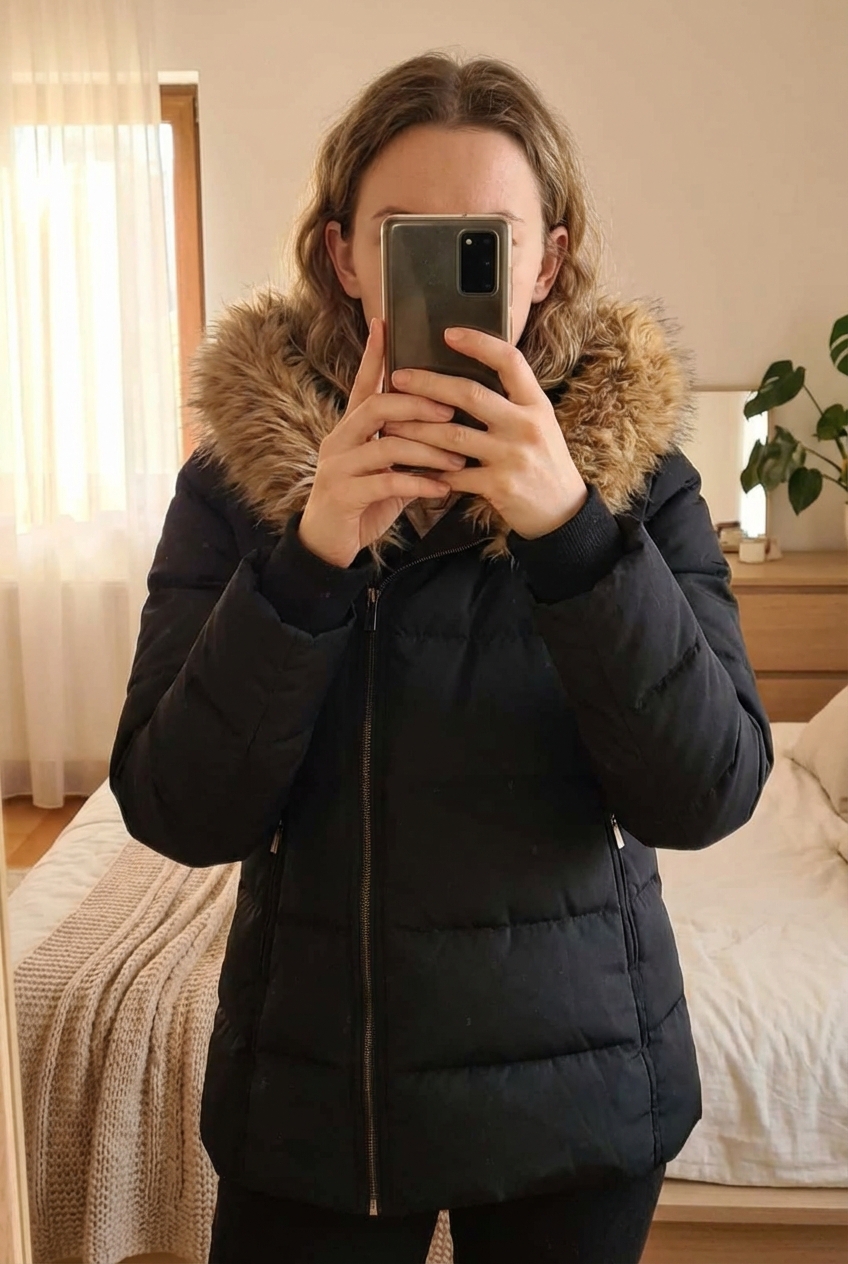 Parka cache-cache noir taille L debout, face à la caméra, dans une chambre à la lumière douce, avec une lumière naturelle filtrant par la fenêtre.