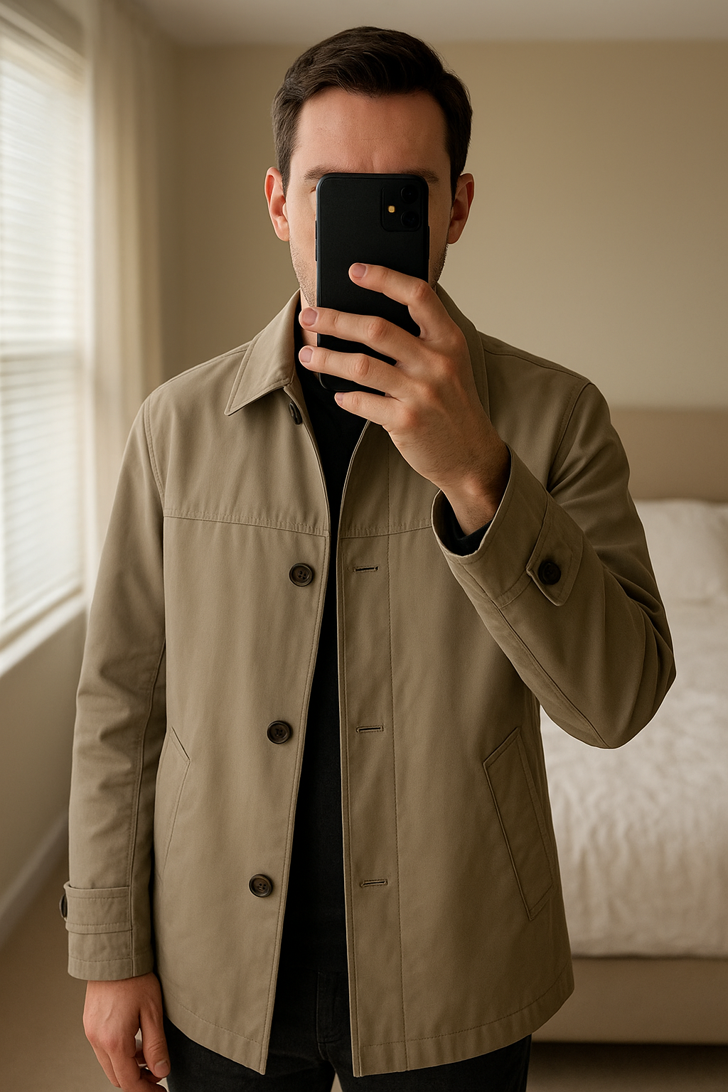 Parka imperméable debout, face à la caméra, dans une chambre à la lumière douce, avec une lumière naturelle filtrant par la fenêtre.