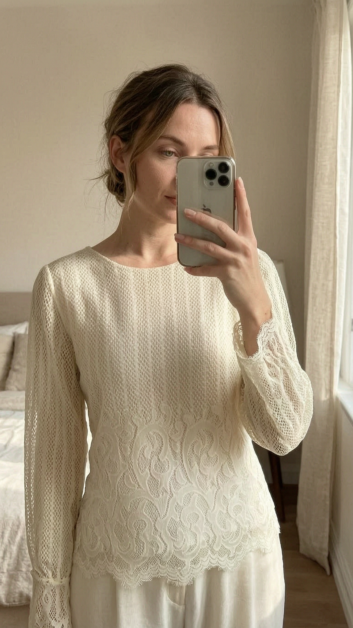 A person in Part Two Lace Blouse | Romantic Parisian | Elegant Boho Chic | Sheer Long Sleeve | Size 36 / 10 standing straight facing the camera, in a softly lit bedroom setting, with gentle natural light filtering through a window.