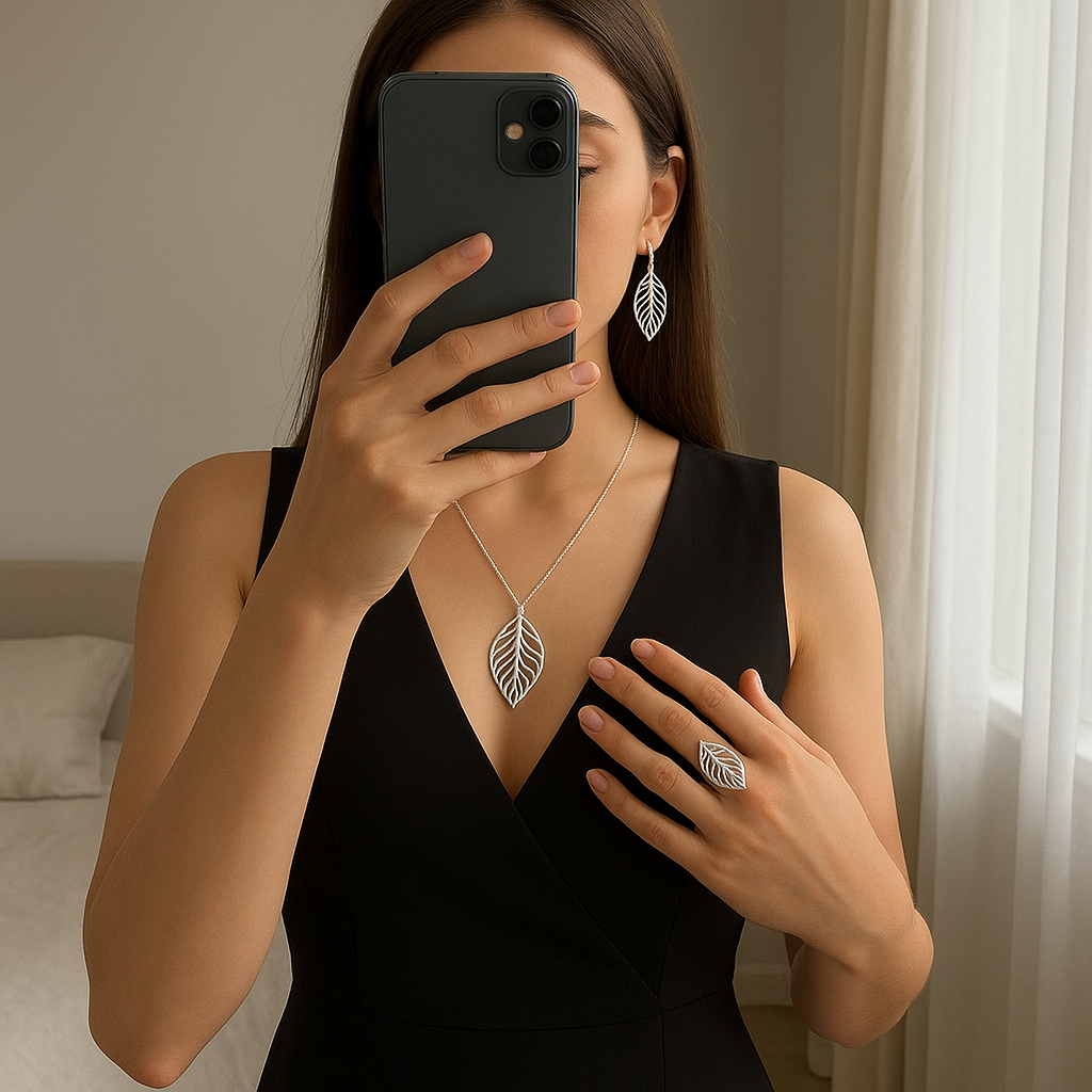 Une personne en Parure argentée feuille – collier, boucles & bague assortis debout, face à la caméra, dans une chambre à la lumière douce, avec une lumière naturelle filtrant par la fenêtre.