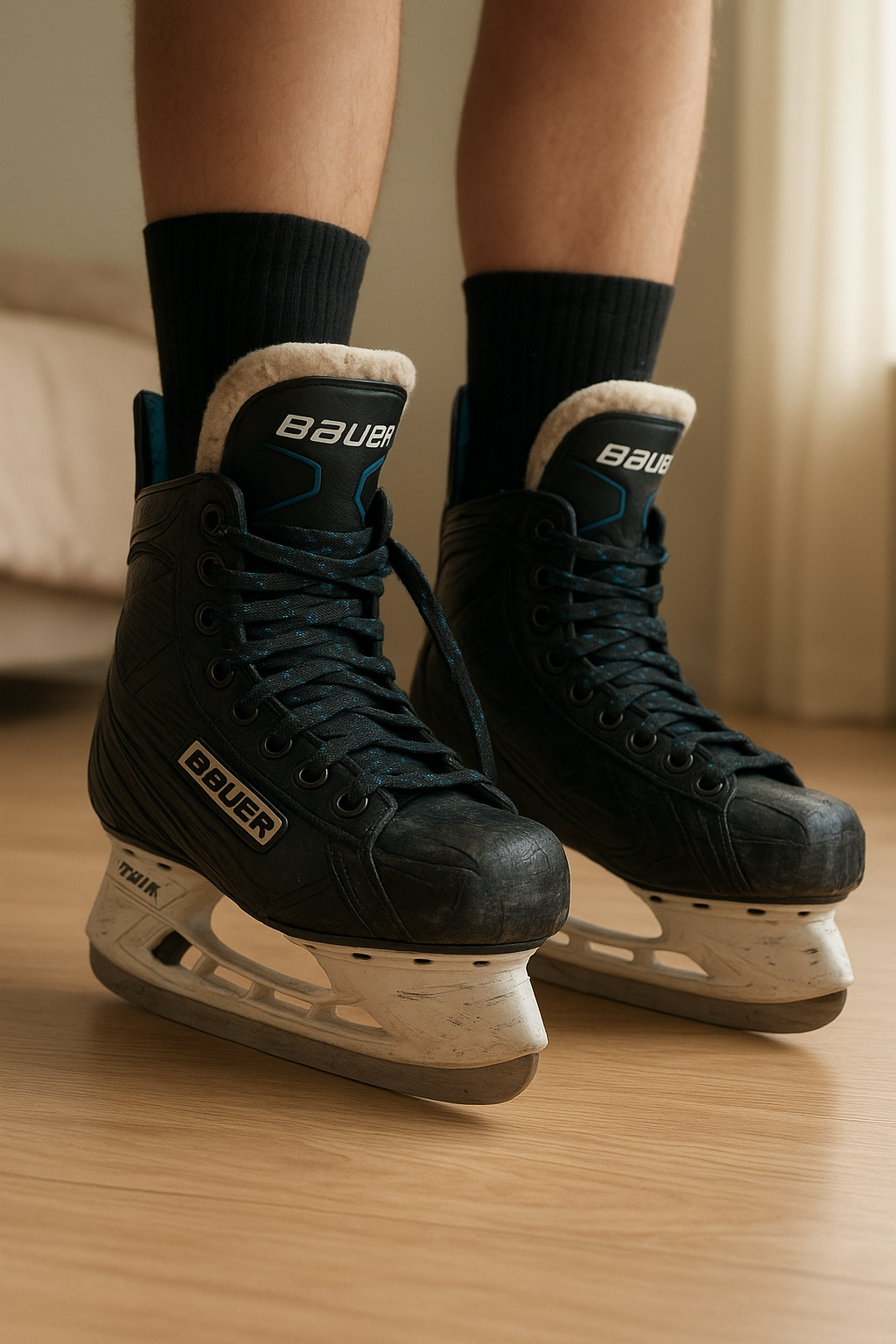 Patin de hockey sur glace Bauer debout, face à la caméra, dans une chambre à la lumière douce, avec une lumière naturelle filtrant par la fenêtre.
