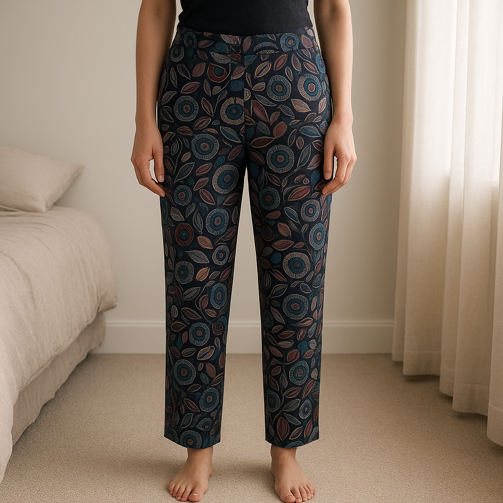 Patterned skirt standing straight facing the camera, in a softly lit bedroom setting, with gentle natural light filtering through a window.