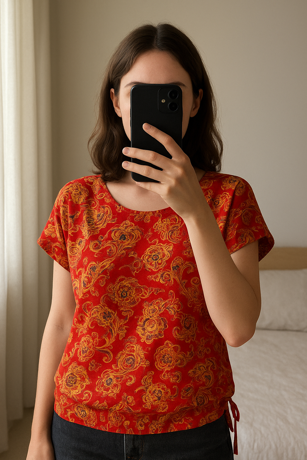 Patterned T-shirt standing straight facing the camera, in a softly lit bedroom setting, with gentle natural light filtering through a window.
