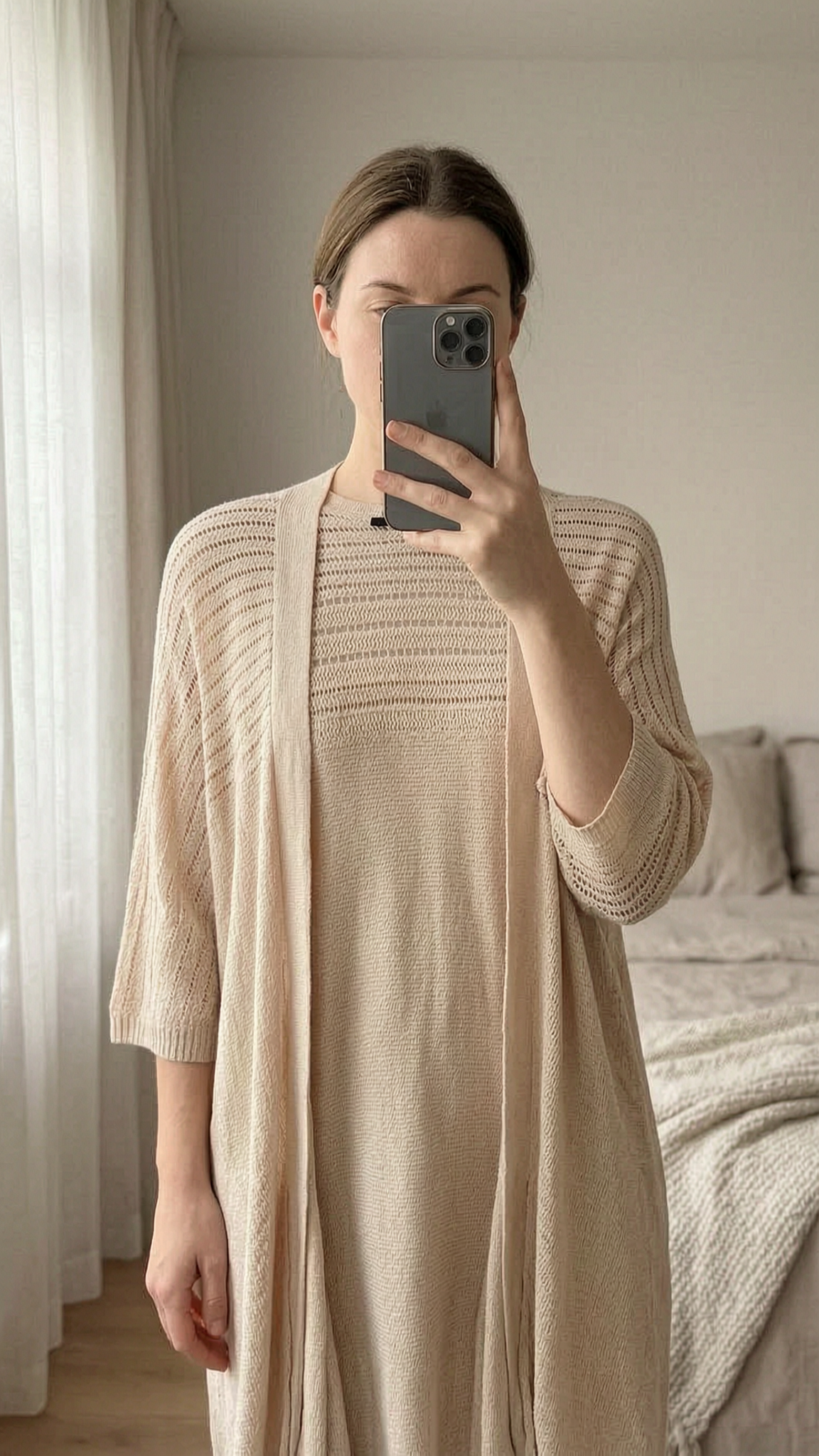 Peacocks beige longline open knit cardigan size M cover up standing straight facing the camera, in a softly lit bedroom setting, with gentle natural light filtering through a window.