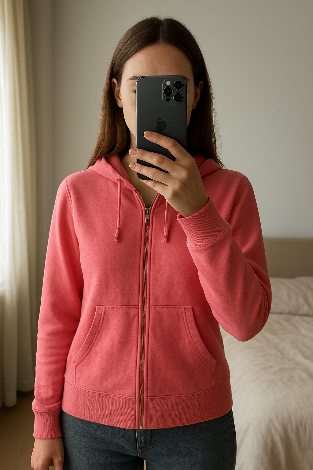 Peacocks jacket standing straight facing the camera, in a softly lit bedroom setting, with gentle natural light filtering through a window.