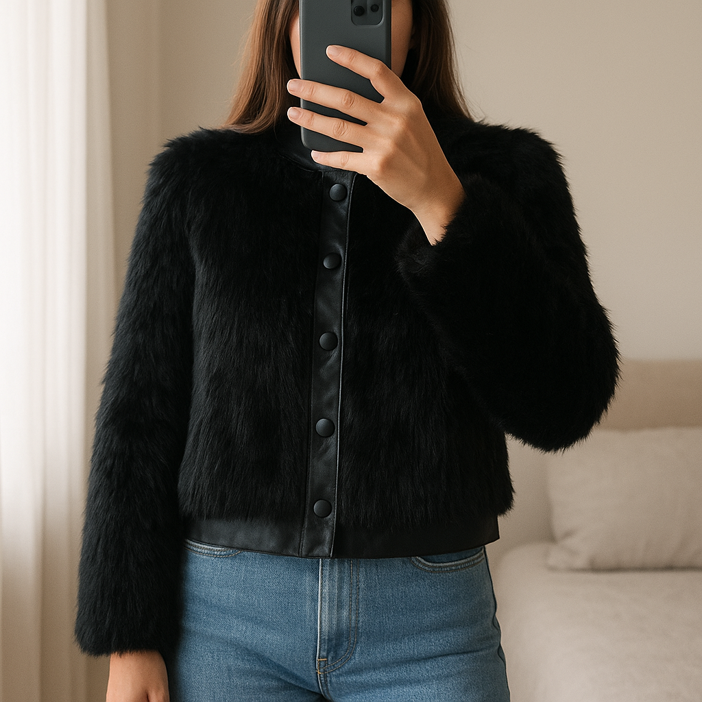 Pelliccia sintetica Twinset in piedi, rivolto verso la fotocamera, in una camera da letto con luce soffusa e luce naturale che filtra dalla finestra.