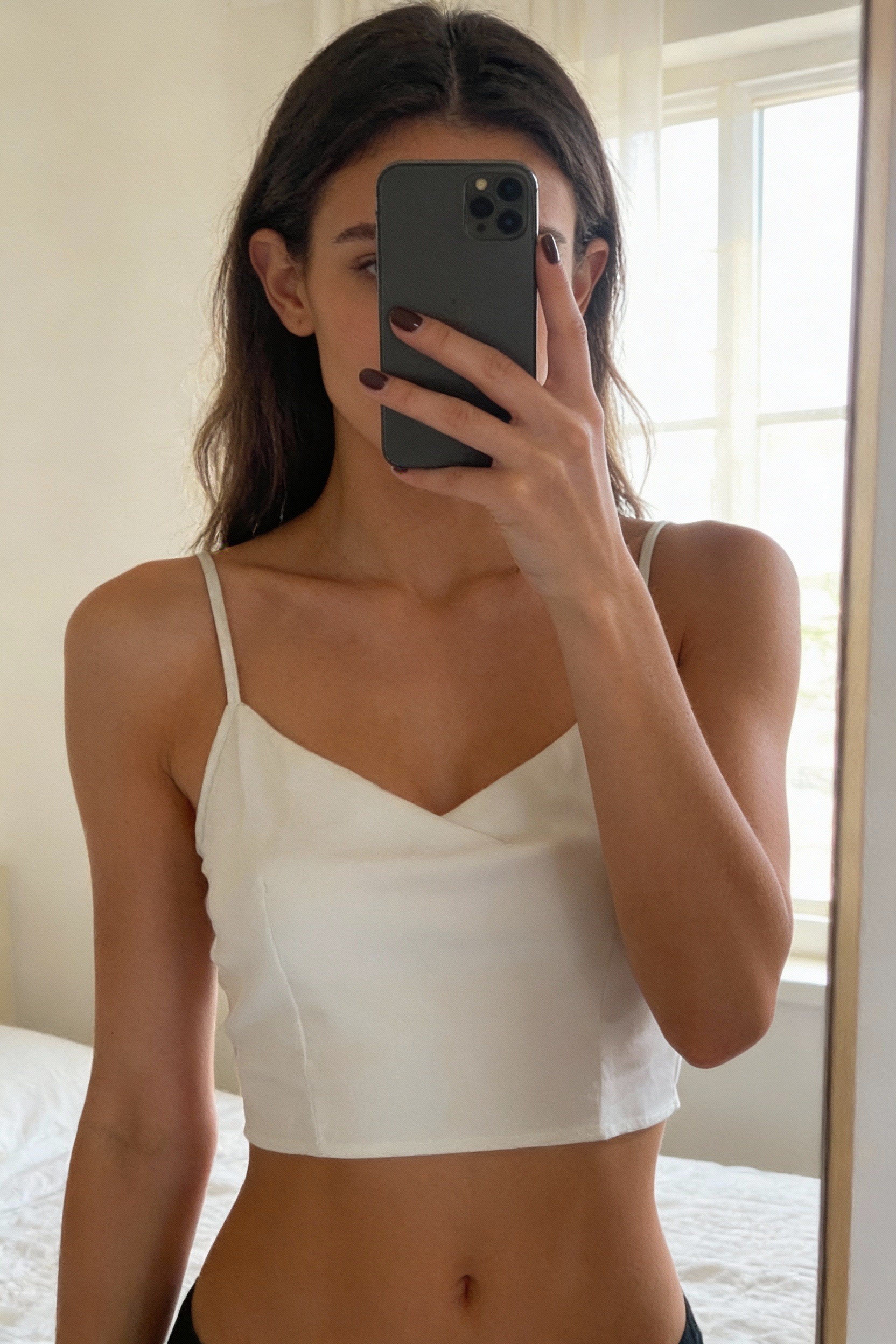 Une personne en petit débardeur amples | T38/M debout, face à la caméra, avec une silhouette fine, dans une chambre à la lumière douce, avec une lumière naturelle filtrant par la fenêtre.