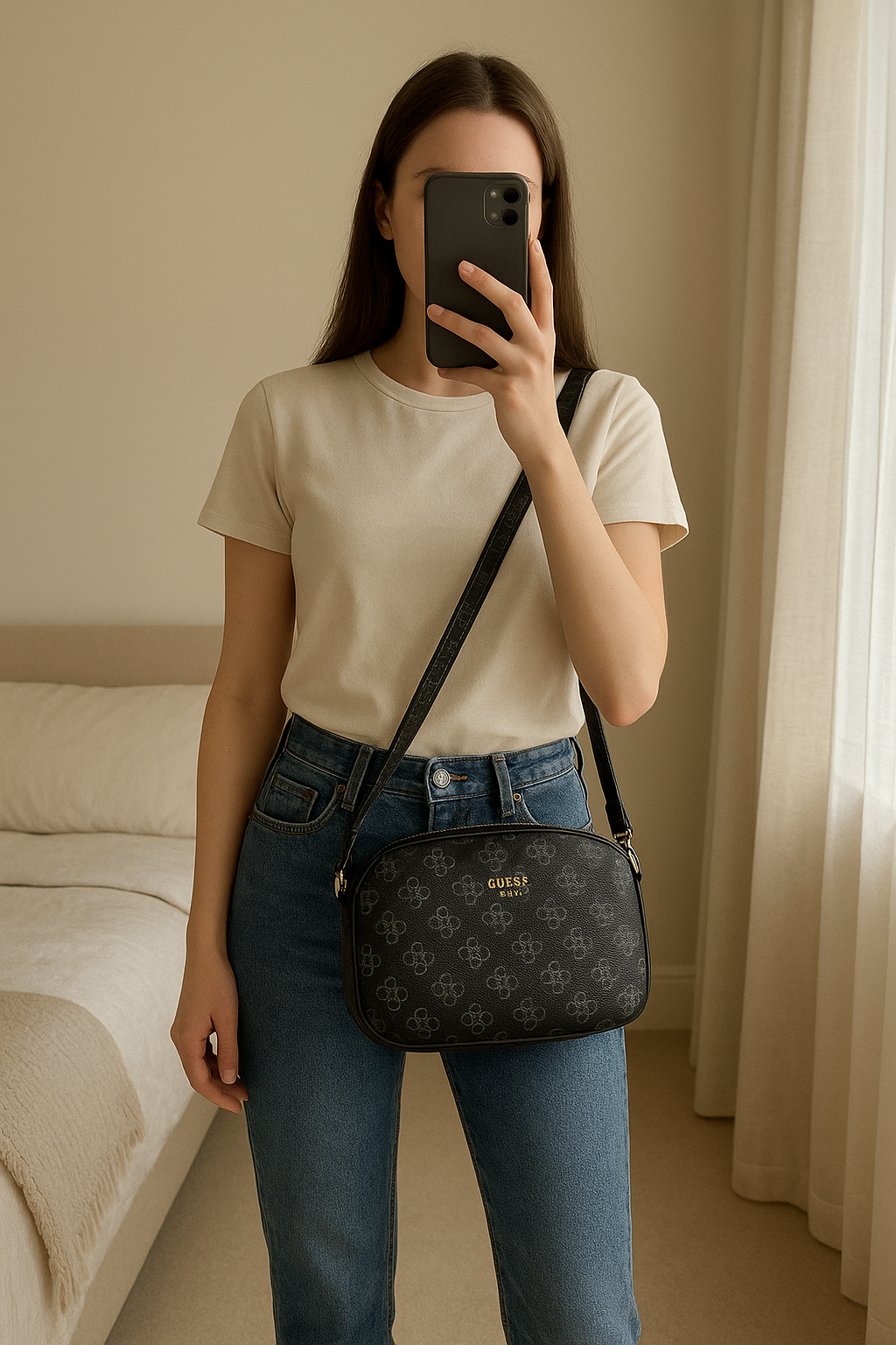 Petit sac à bandoulière guess noir et bleu debout, face à la caméra, dans une chambre à la lumière douce, avec une lumière naturelle filtrant par la fenêtre.
