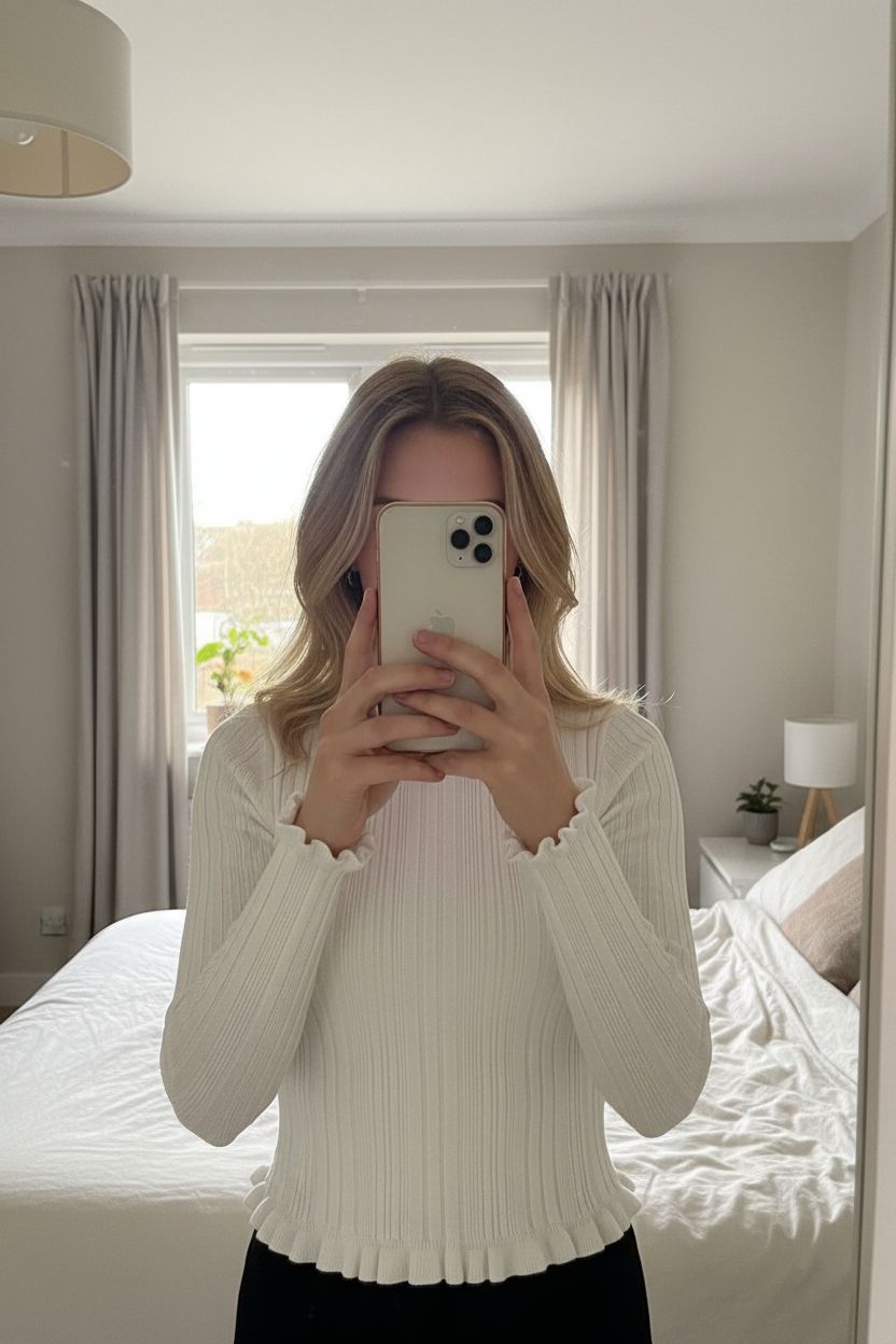 Petite Miss Selfridge white turtle neck jumper standing straight facing the camera, in a softly lit bedroom setting, with gentle natural light filtering through a window.