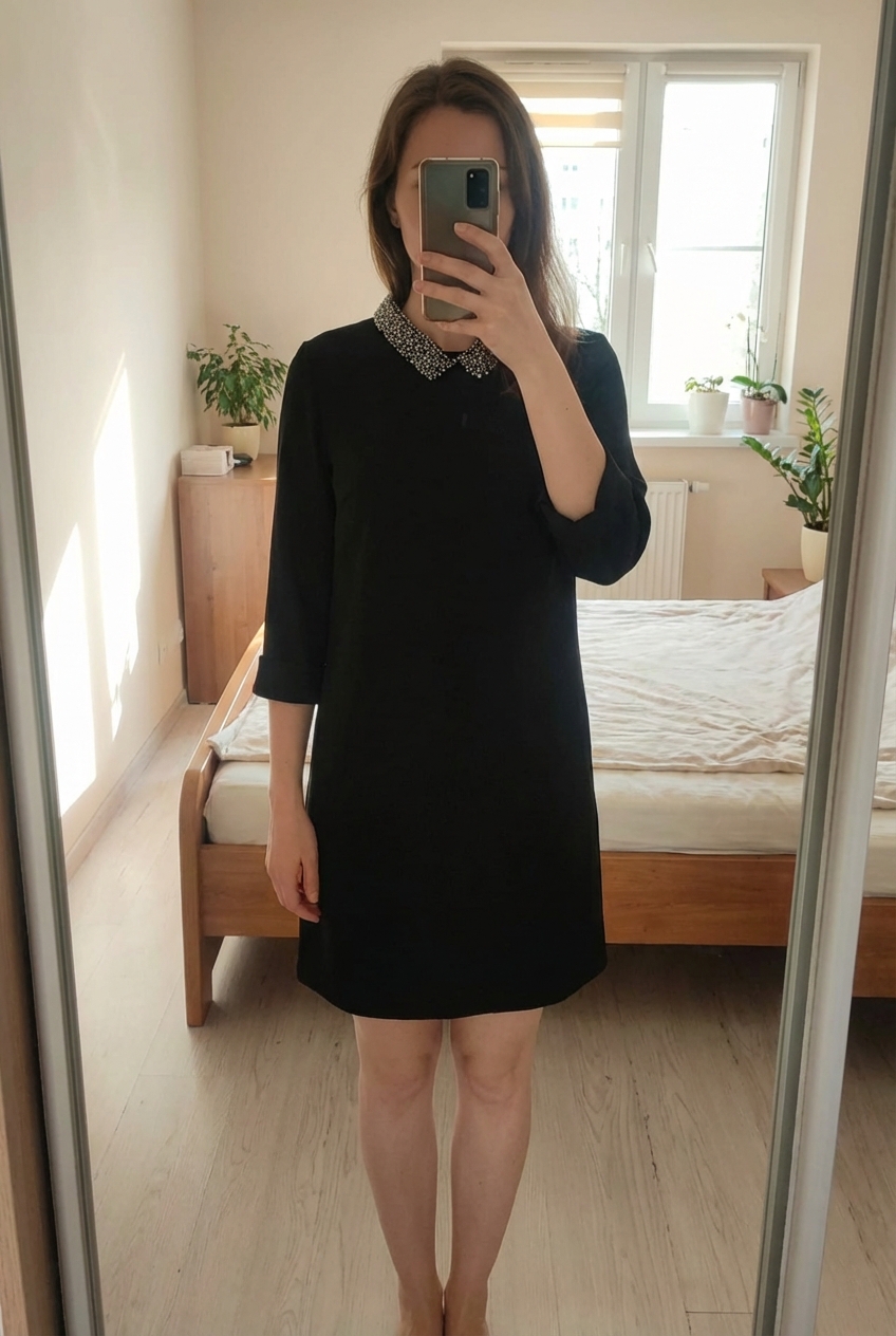 Petite robe noir avec collier perlé debout, face à la caméra, dans une chambre à la lumière douce, avec une lumière naturelle filtrant par la fenêtre.