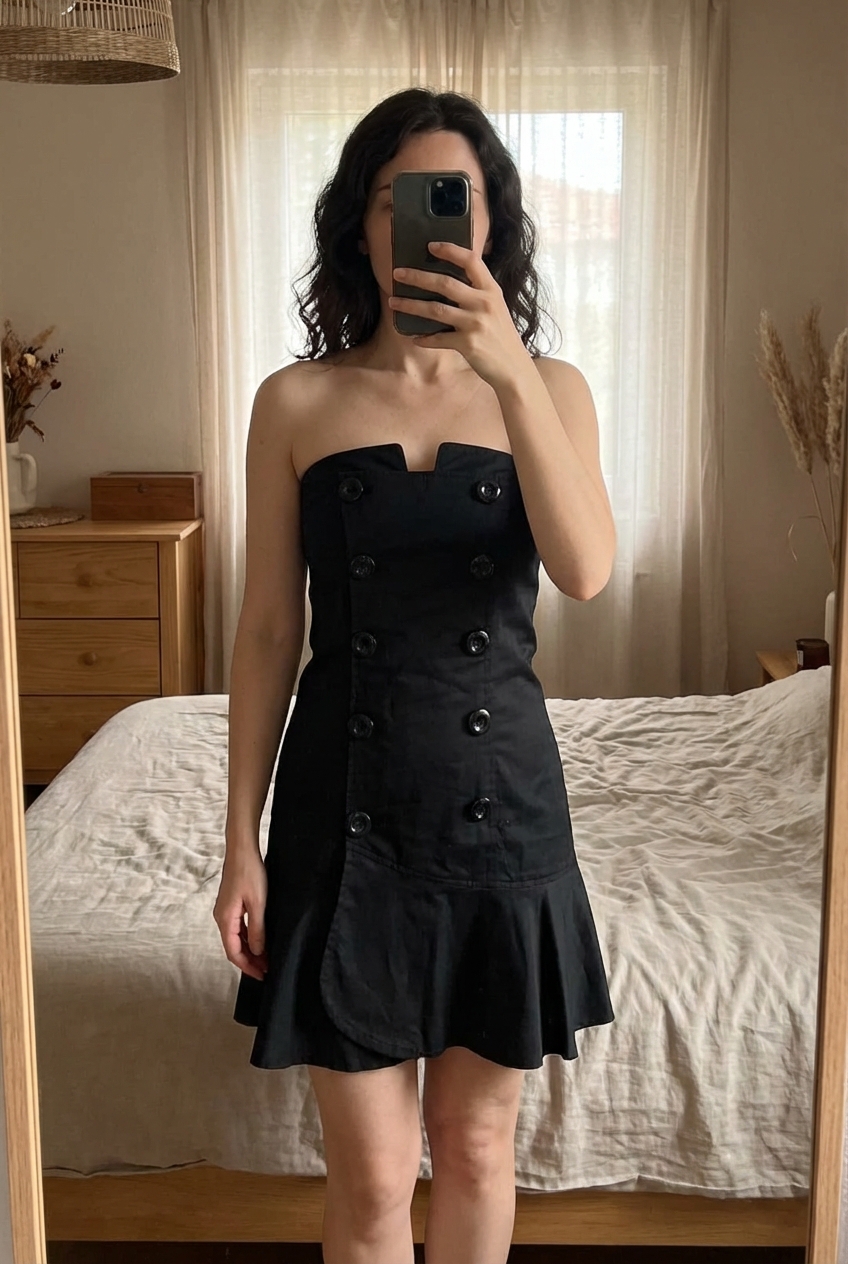 Petite robe noir bustier taille L debout, face à la caméra, dans une chambre à la lumière douce, avec une lumière naturelle filtrant par la fenêtre.