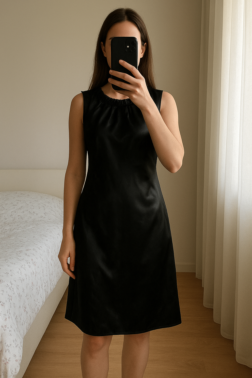 petite robe noire courte en satin avec fausses plumes à l'encolure T42 debout, face à la caméra, dans une chambre à la lumière douce, avec une lumière naturelle filtrant par la fenêtre.
