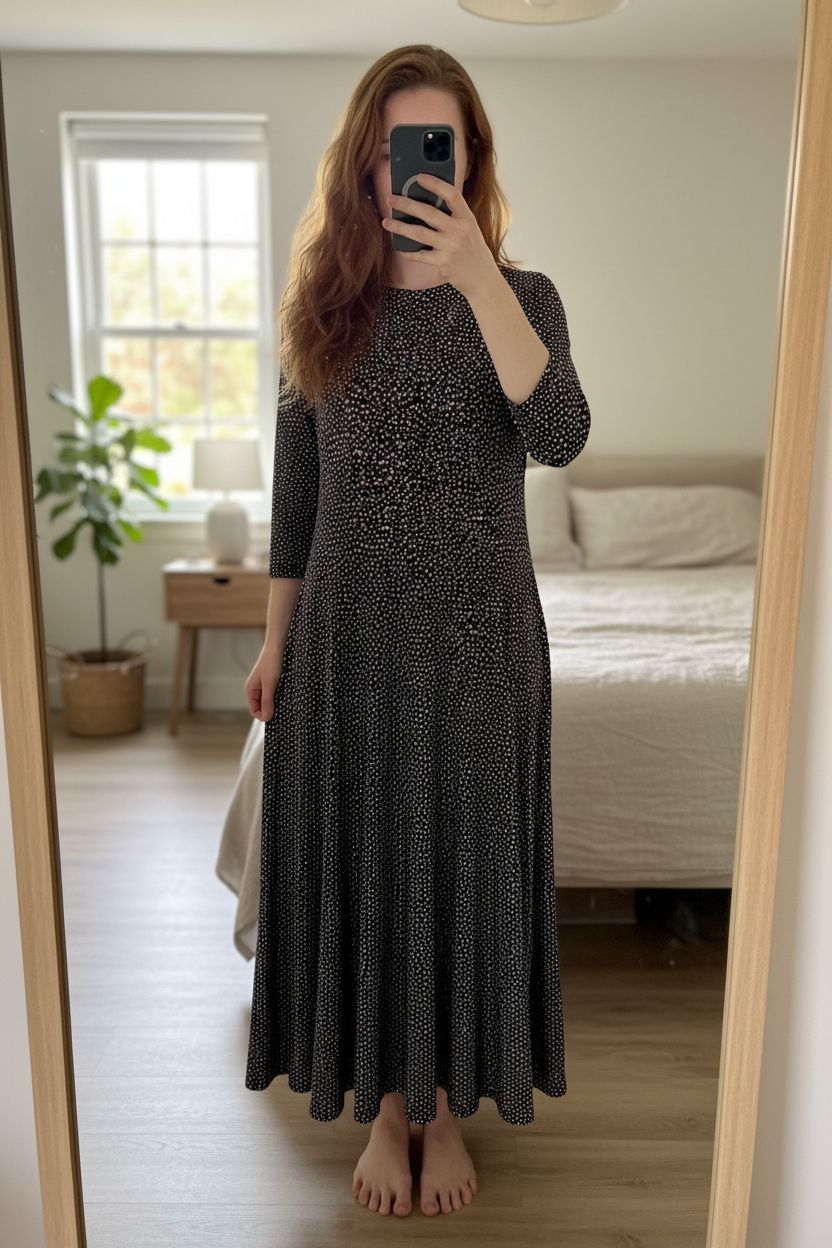 Phase Eight black white spot print flared soft jersey dress UK 8 swing skirt monochrome cottagecore standing straight facing the camera, in a softly lit bedroom setting, with gentle natural light filtering through a window.
