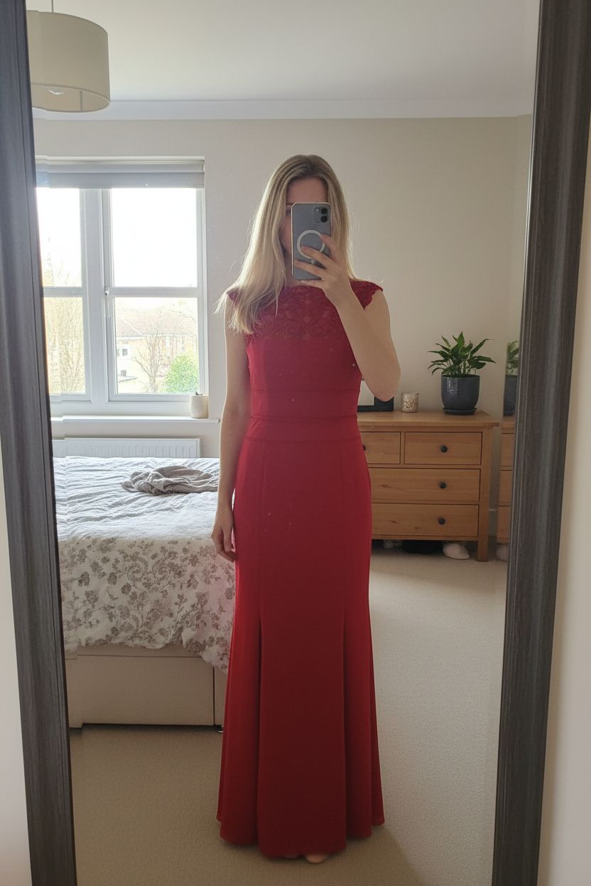Phase Eight Red Satin Maxi Dress 14 standing straight facing the camera, in a softly lit bedroom setting, with gentle natural light filtering through a window.