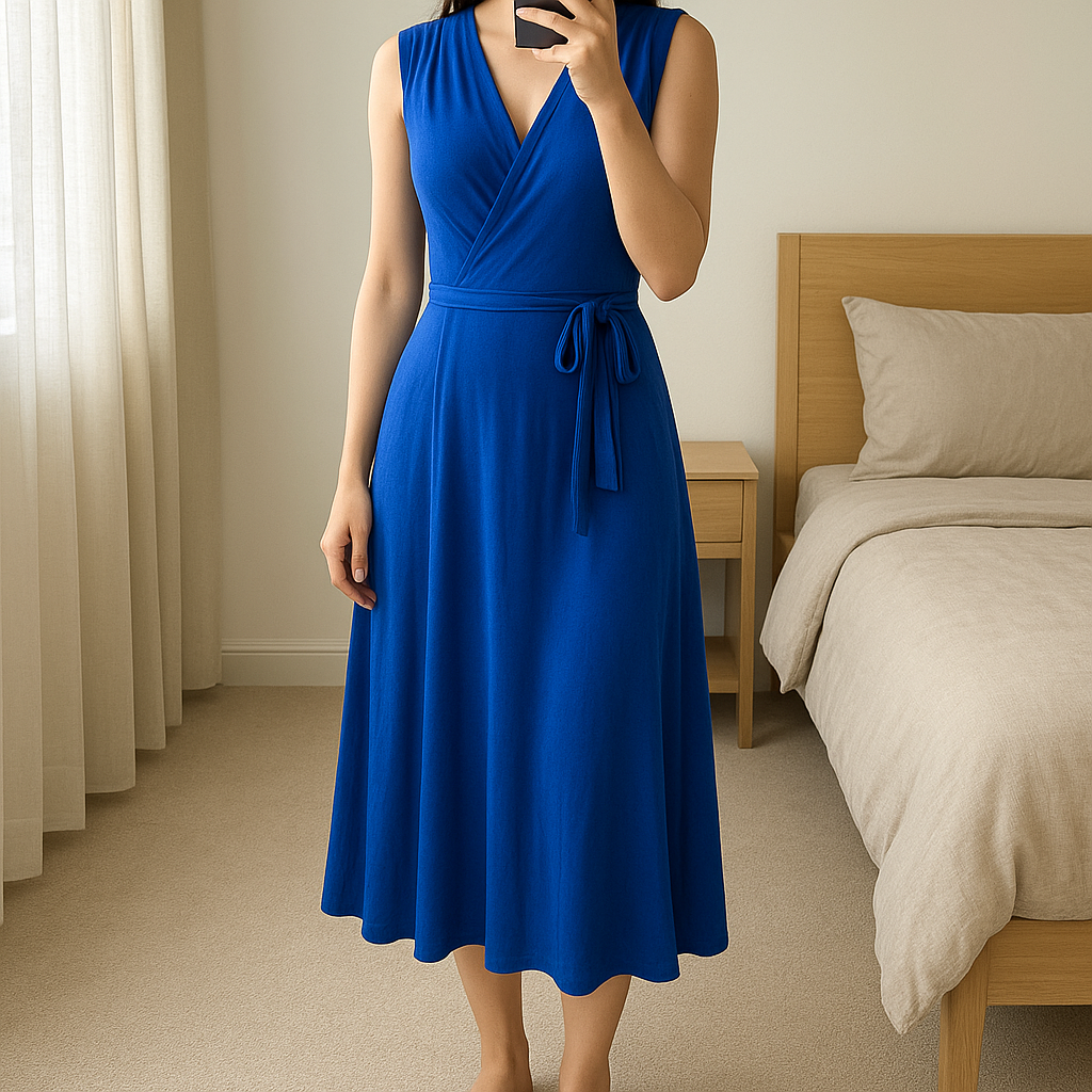 Phase Eight Royal Blue Jersey Stretch Wrap Around Dress With Tie Belt - Size 12 standing straight facing the camera, in a softly lit bedroom setting, with gentle natural light filtering through a window.