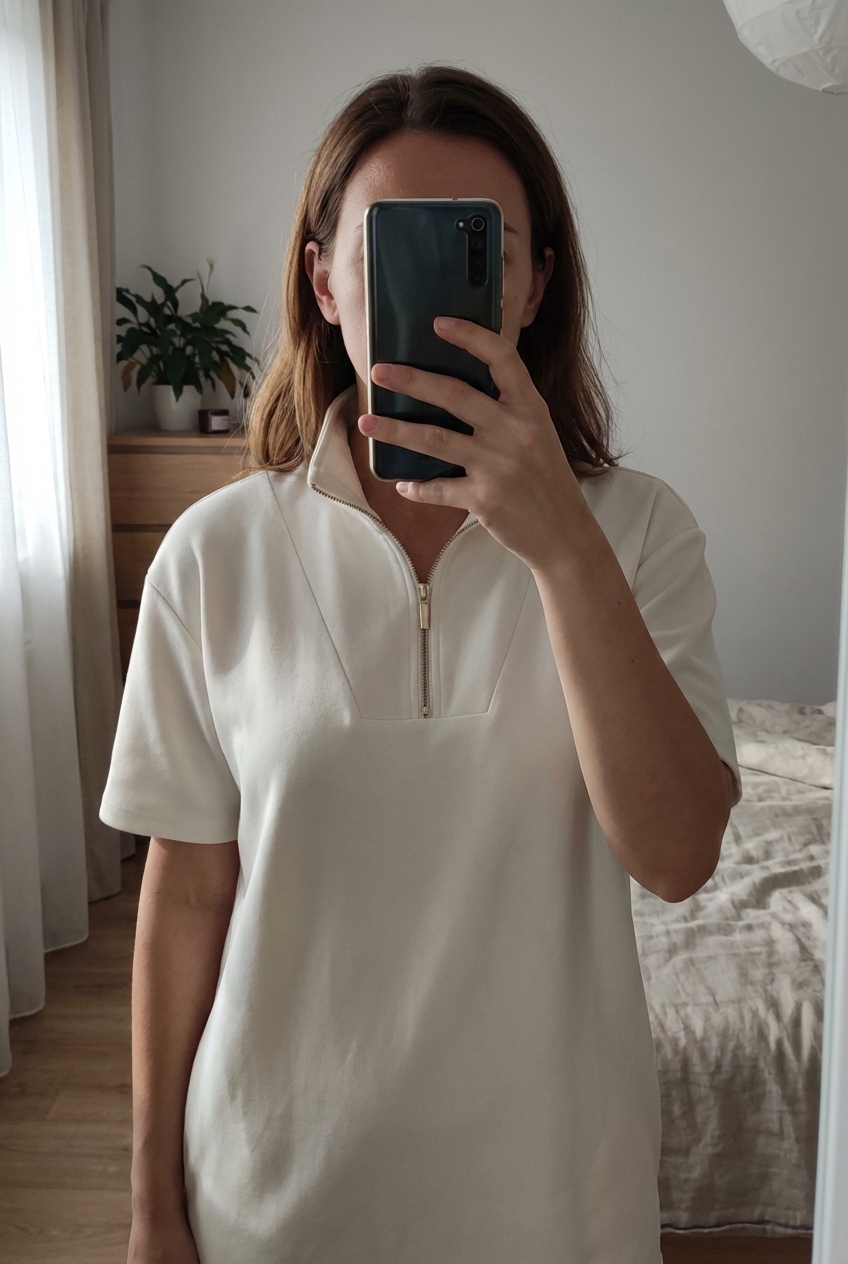 A person in Pihe puha fehér felső 🤍 standing straight facing the camera, in a softly lit bedroom setting, with gentle natural light filtering through a window.