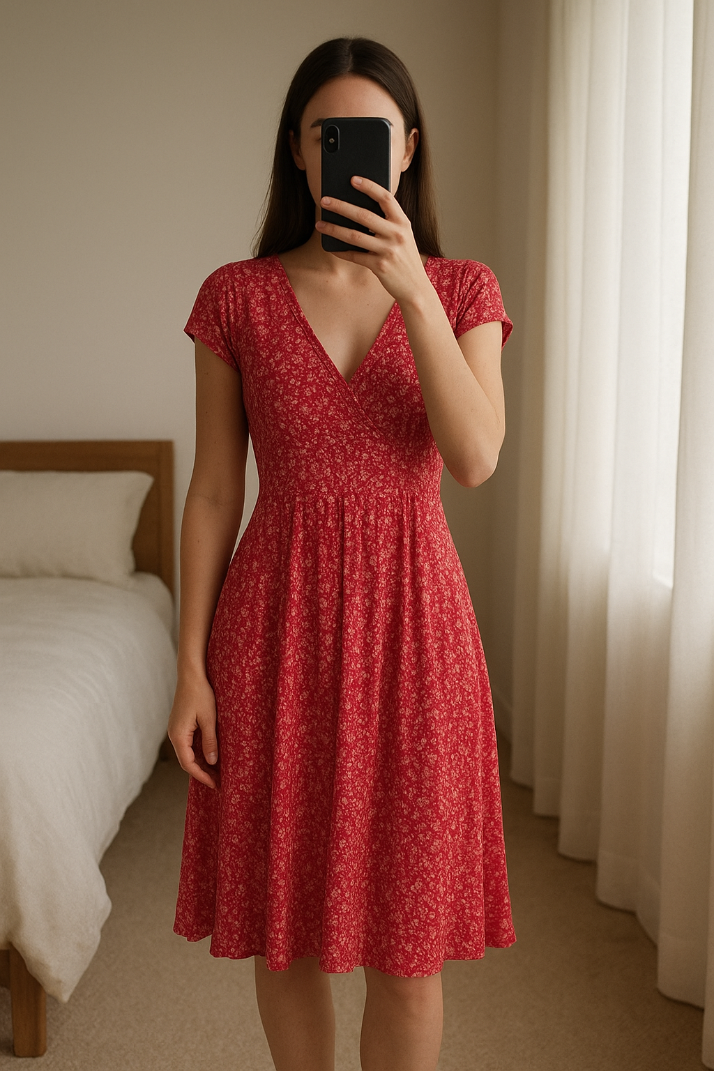 Pink floral dress standing straight facing the camera, in a softly lit bedroom setting, with gentle natural light filtering through a window.