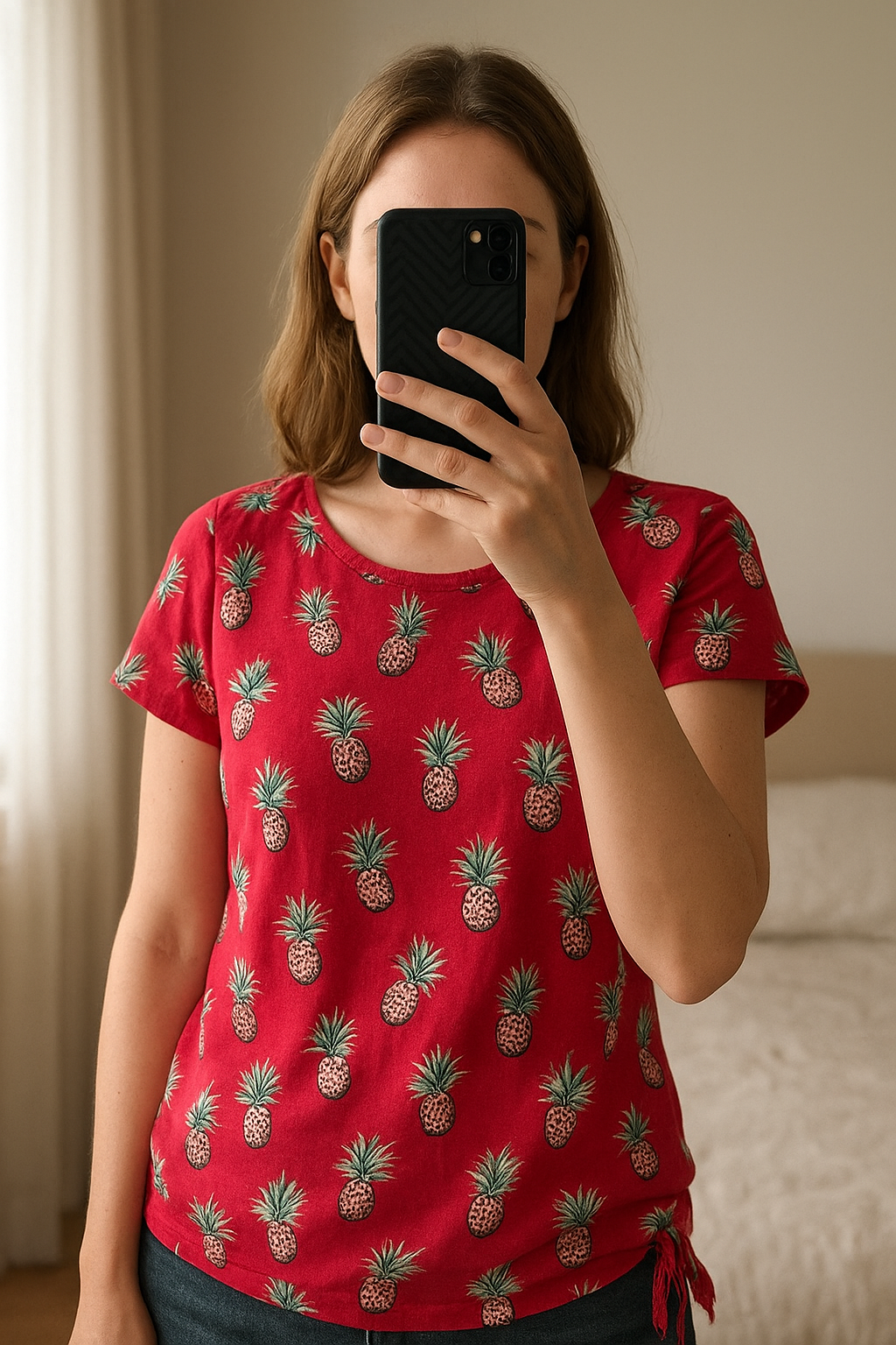 Pink pineapple T-shirt standing straight facing the camera, in a softly lit bedroom setting, with gentle natural light filtering through a window.