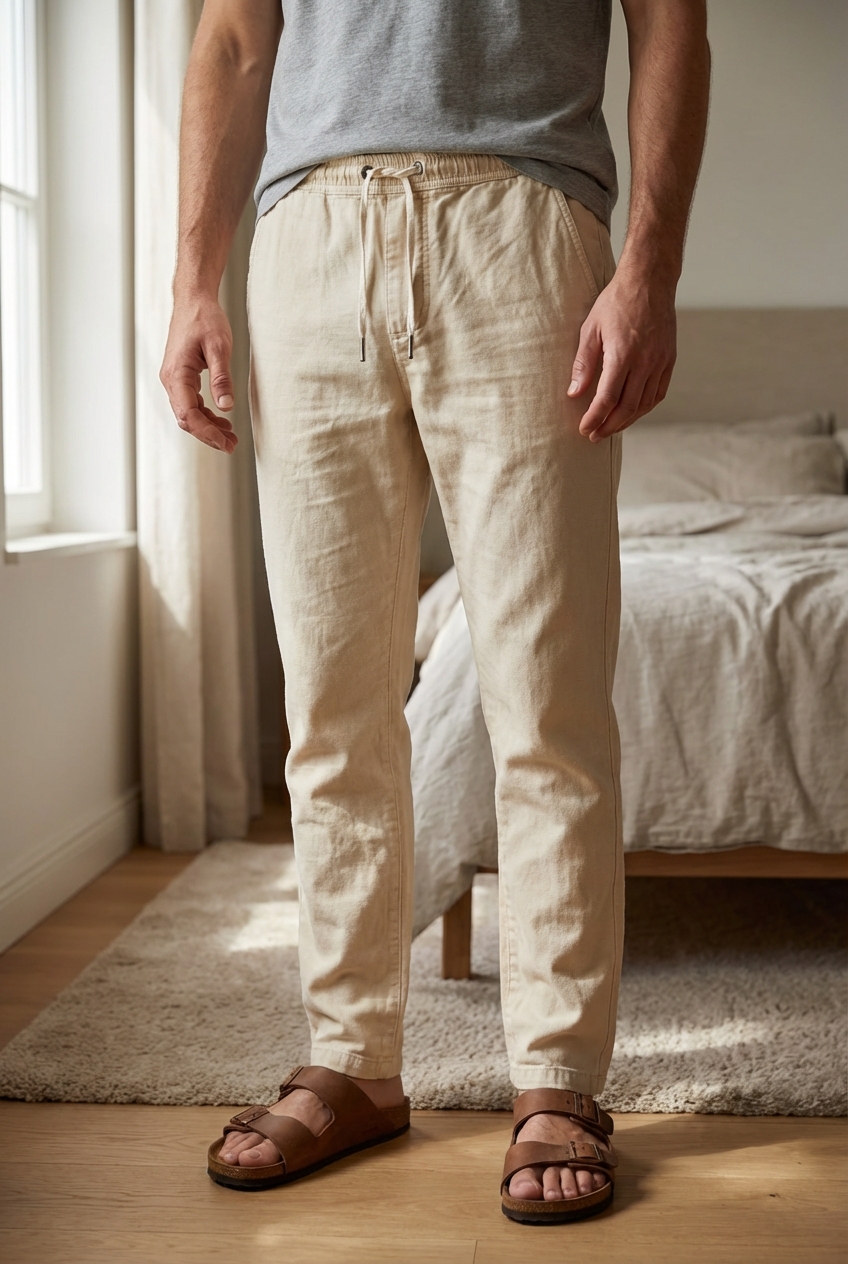 Plantalon Homme Ikks couleur Crème fluide Lin & Lyocell | Taille S debout, face à la caméra, dans une chambre à la lumière douce, avec une lumière naturelle filtrant par la fenêtre.