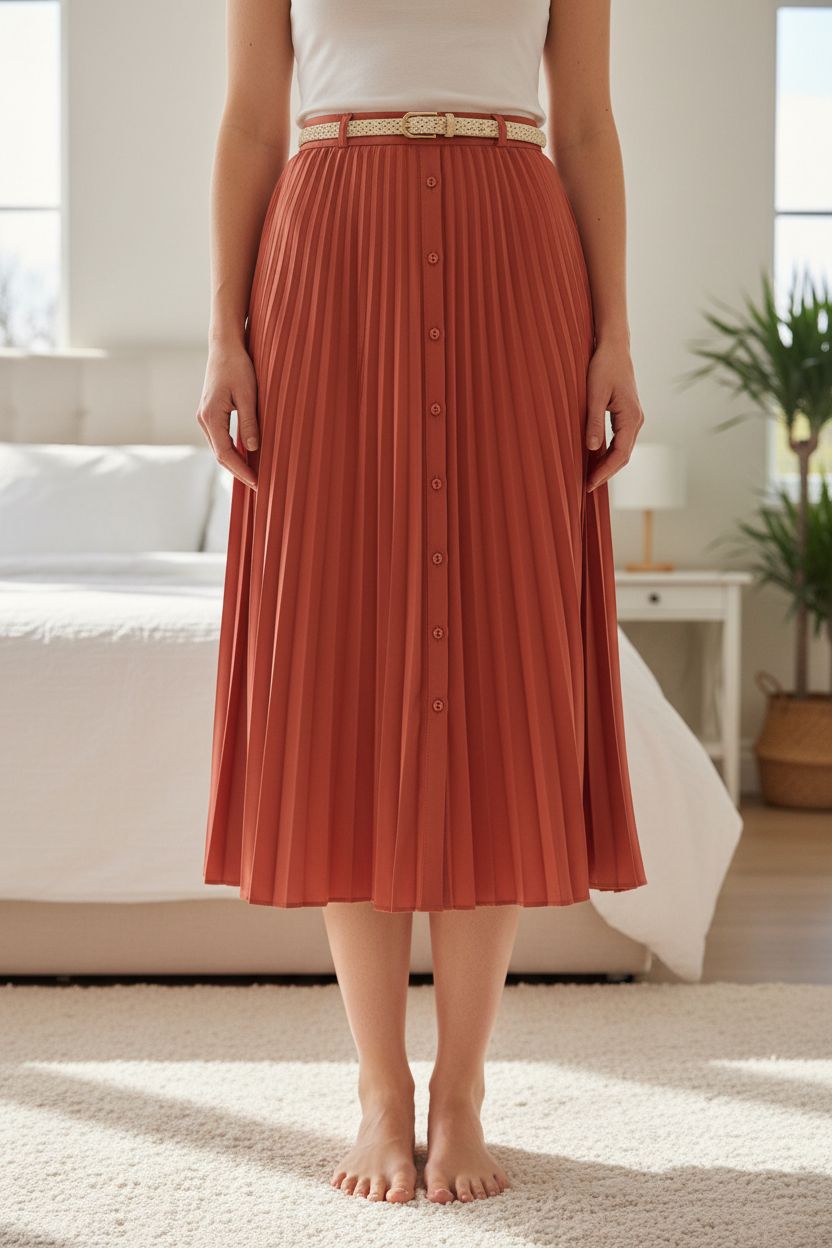 Pleated midi skirt standing straight facing the camera, in a softly lit bedroom setting, with gentle natural light filtering through a window.