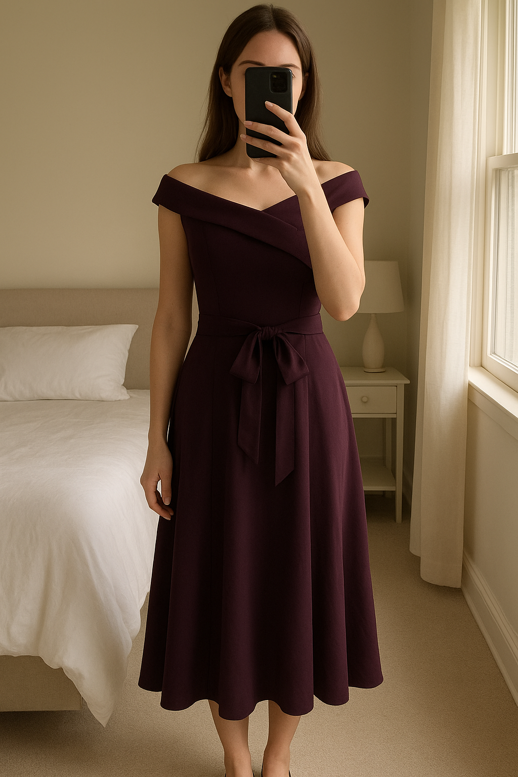 Plum dress standing straight facing the camera, in a softly lit bedroom setting, with gentle natural light filtering through a window.