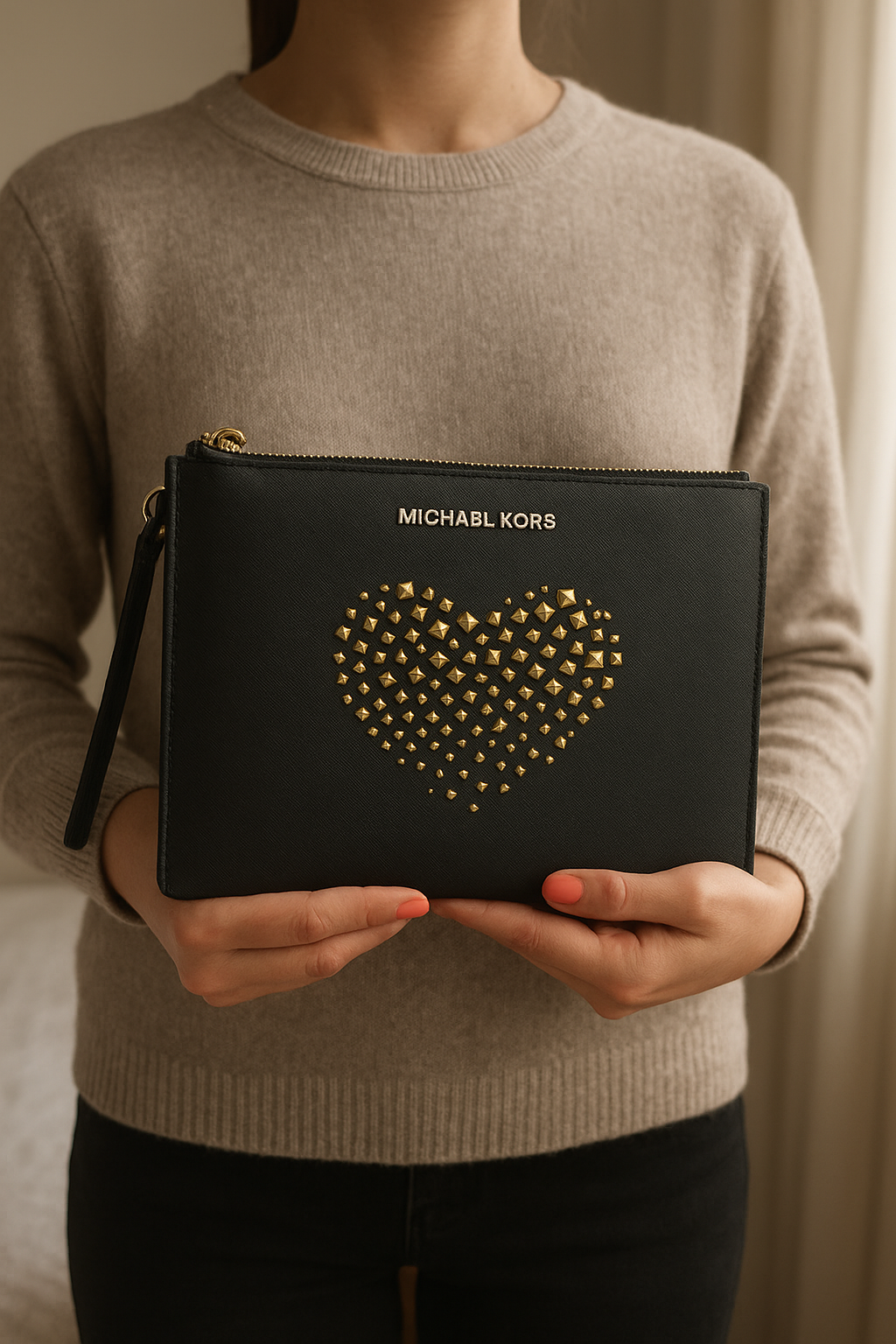 Pochette Michael kors debout, face à la caméra, dans une chambre à la lumière douce, avec une lumière naturelle filtrant par la fenêtre.