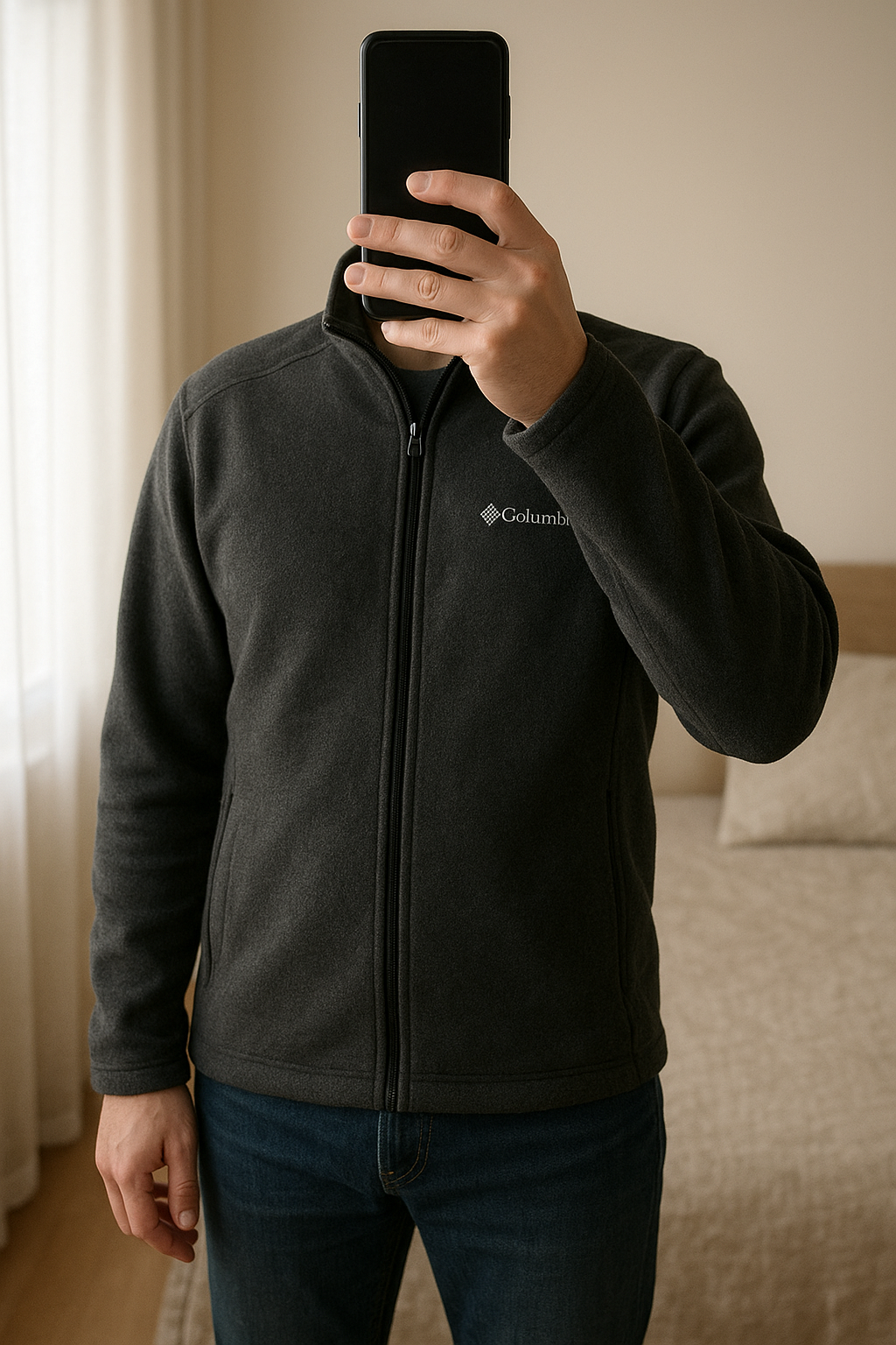 Polaire Columbia gris foncé | pull zip | col roulé avec zip debout, face à la caméra, dans une chambre à la lumière douce, avec une lumière naturelle filtrant par la fenêtre.