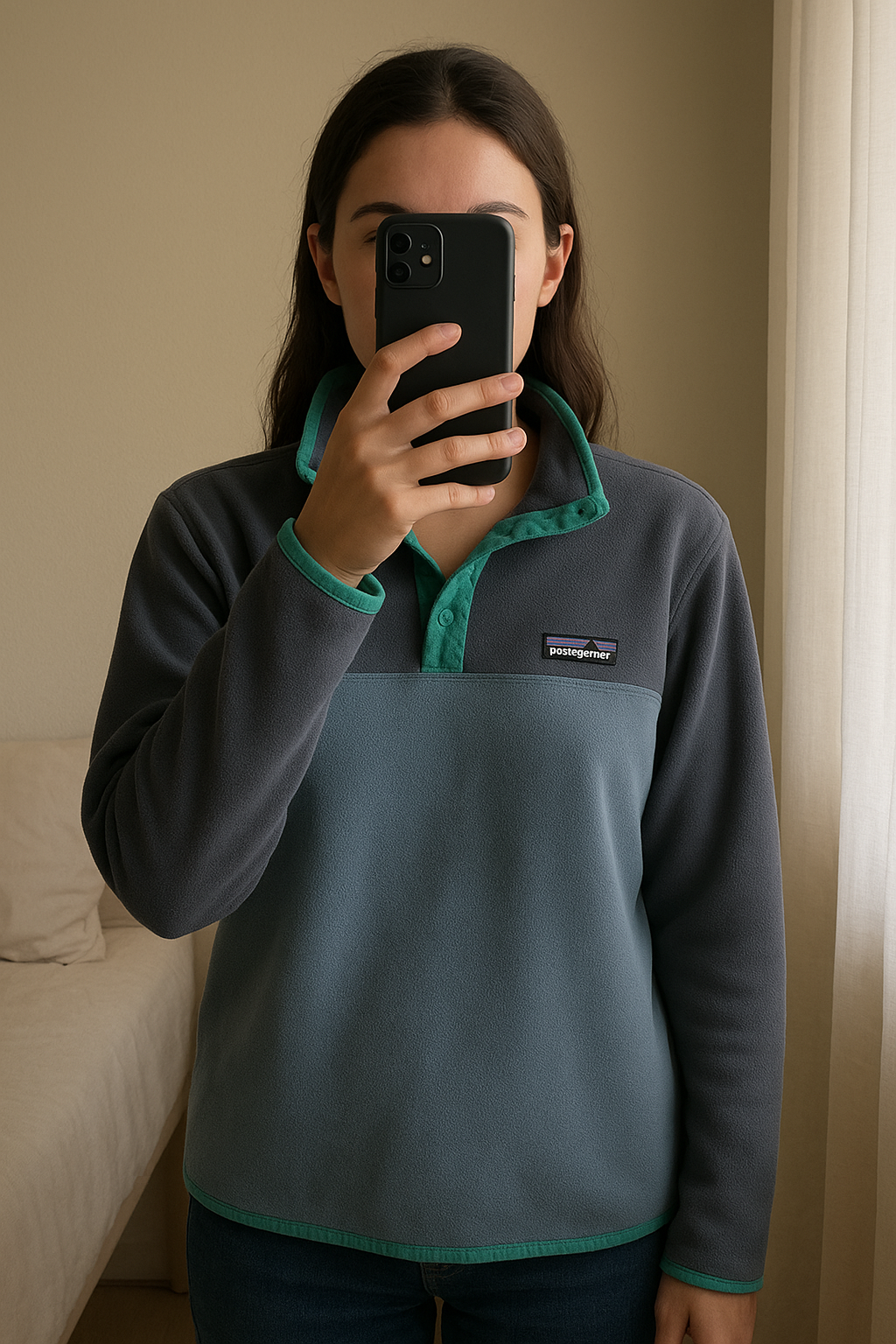 Polaire Patagonia aufrecht stehend, der Kamera zugewandt, in einem sanft beleuchteten Schlafzimmer, mit natürlichem Licht, das durch ein Fenster fällt.