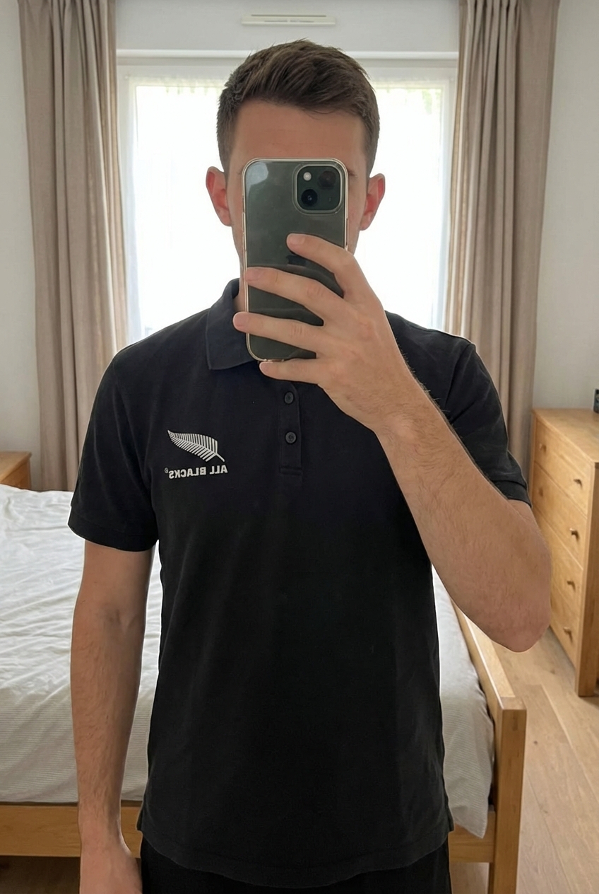 Polo Adidas All Black noir taille L debout, face à la caméra, dans une chambre à la lumière douce, avec une lumière naturelle filtrant par la fenêtre.