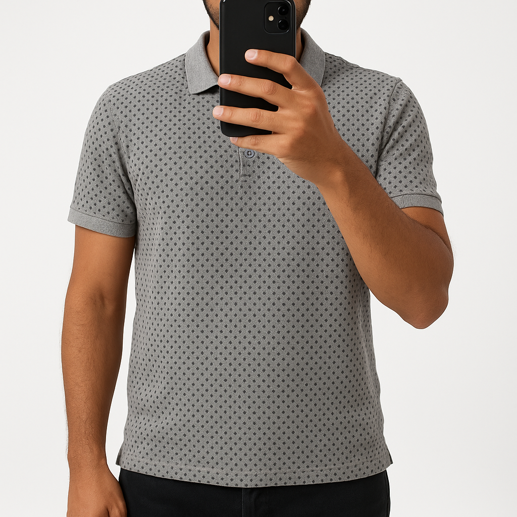 Une personne en polo homme gris zara taille 38 debout, face à la caméra, dans un studio photo épuré avec fond blanc et éclairage doux.