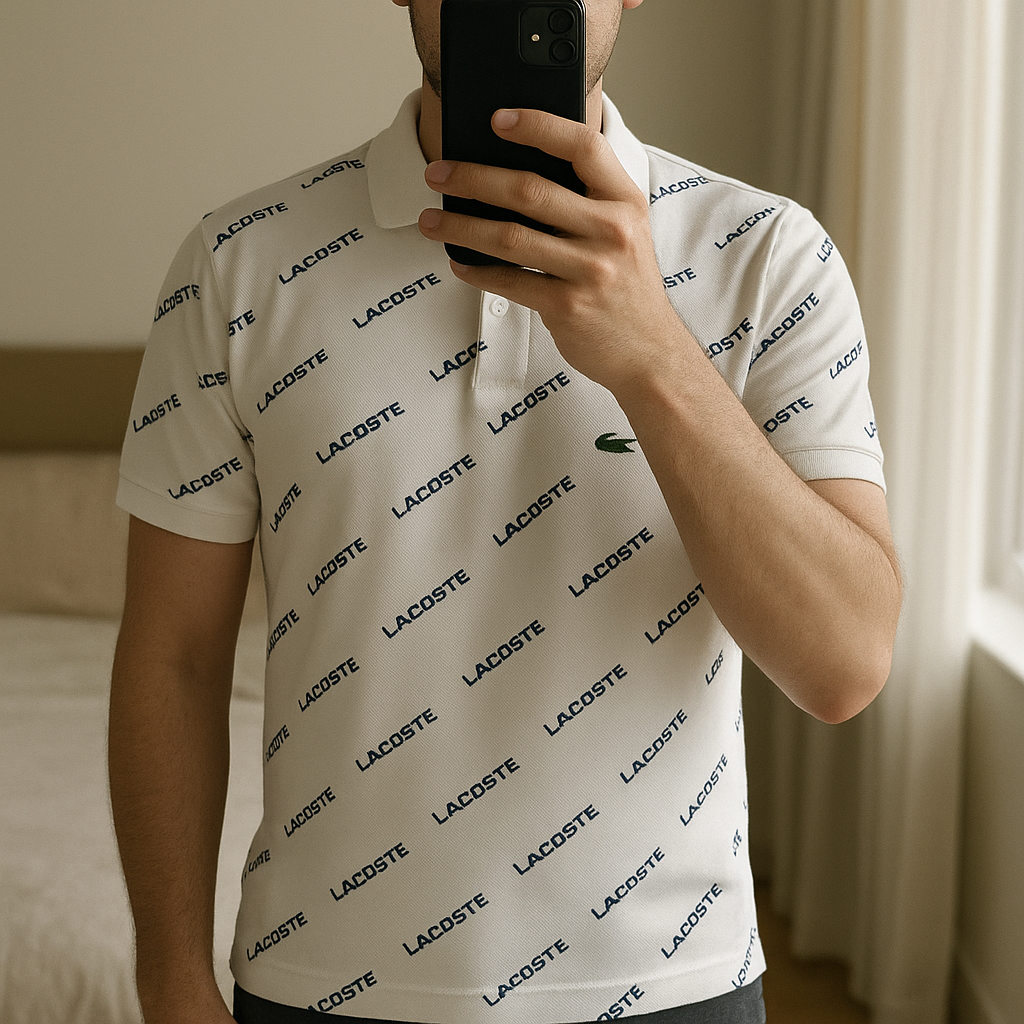 Polo Lacoste debout, face à la caméra, dans une chambre à la lumière douce, avec une lumière naturelle filtrant par la fenêtre.