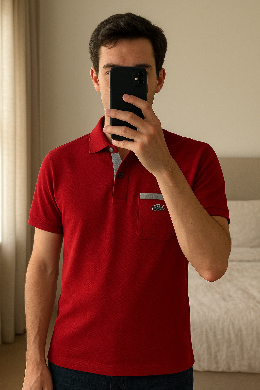 Polo Lacoste debout, face à la caméra, dans une chambre à la lumière douce, avec une lumière naturelle filtrant par la fenêtre.