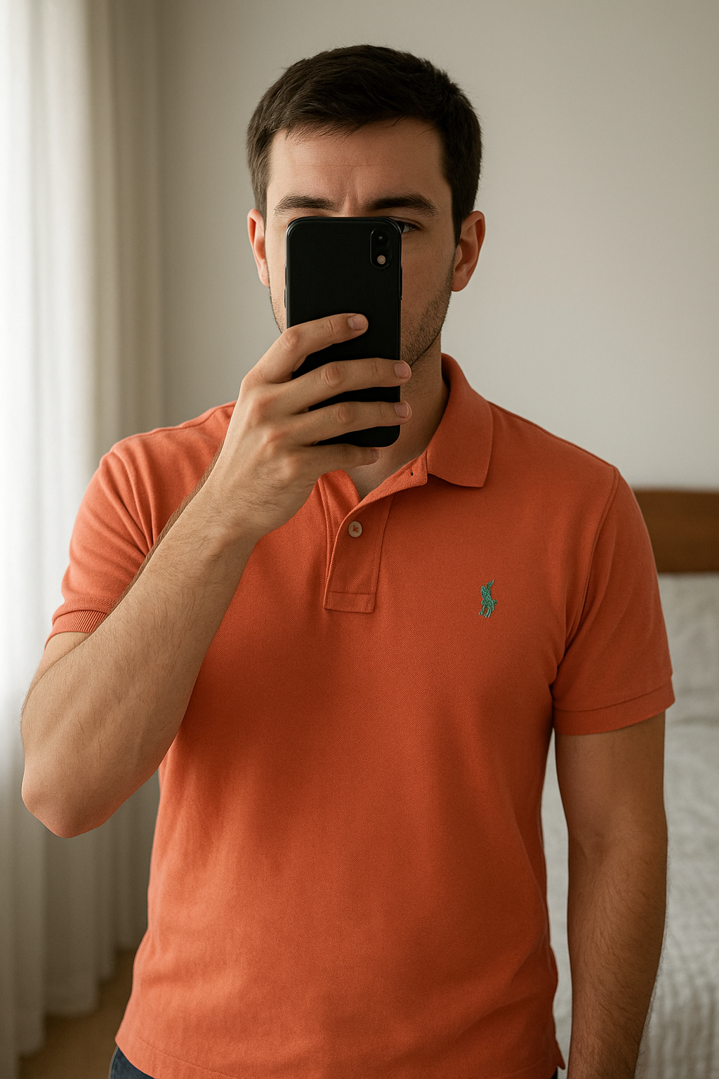 Polo Ralph Lauren debout, face à la caméra, dans une chambre à la lumière douce, avec une lumière naturelle filtrant par la fenêtre.