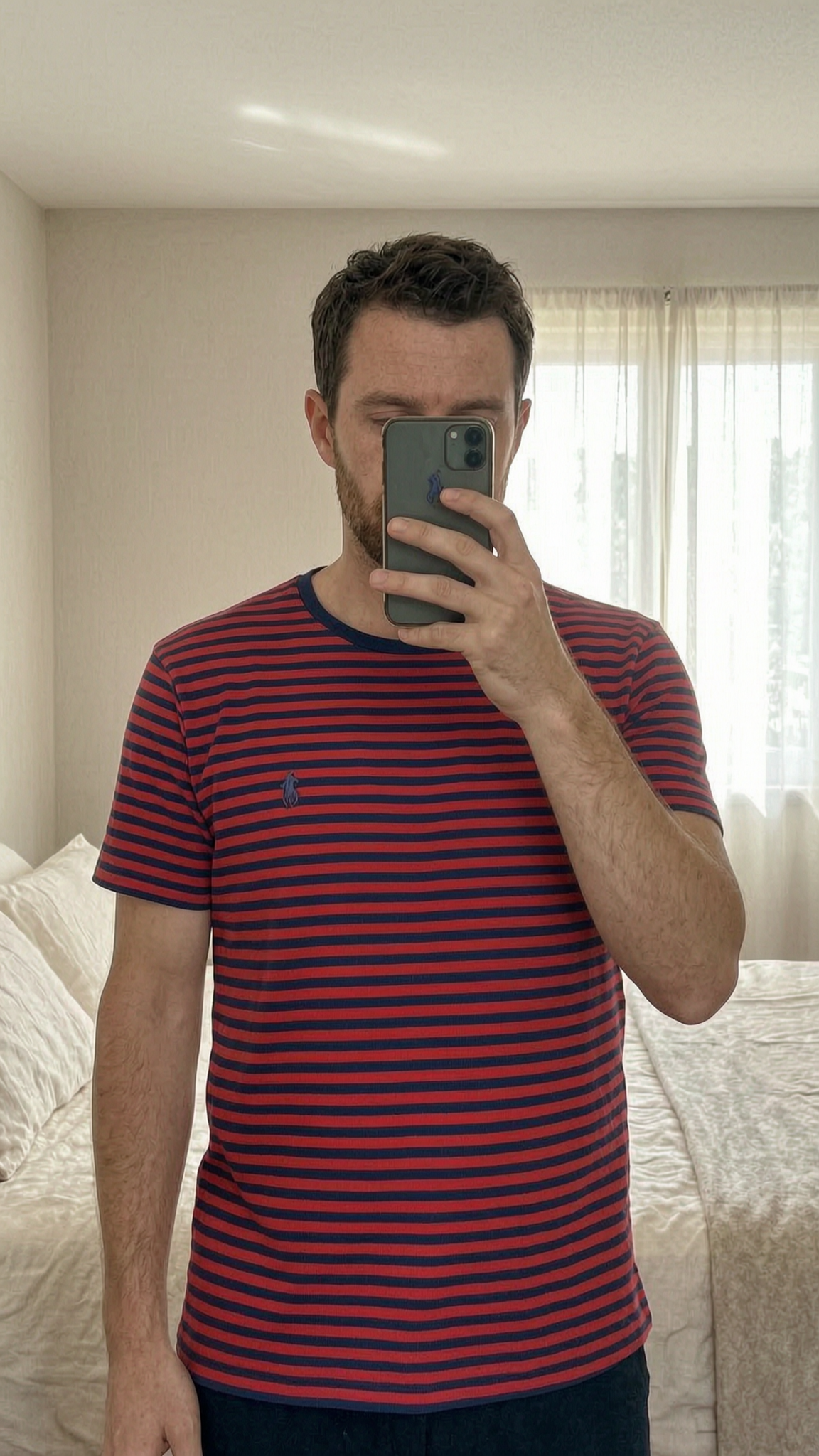 Polo Ralph Lauren T-Shirt - Red Navy Striped - L standing straight facing the camera, in a softly lit bedroom setting, with gentle natural light filtering through a window.