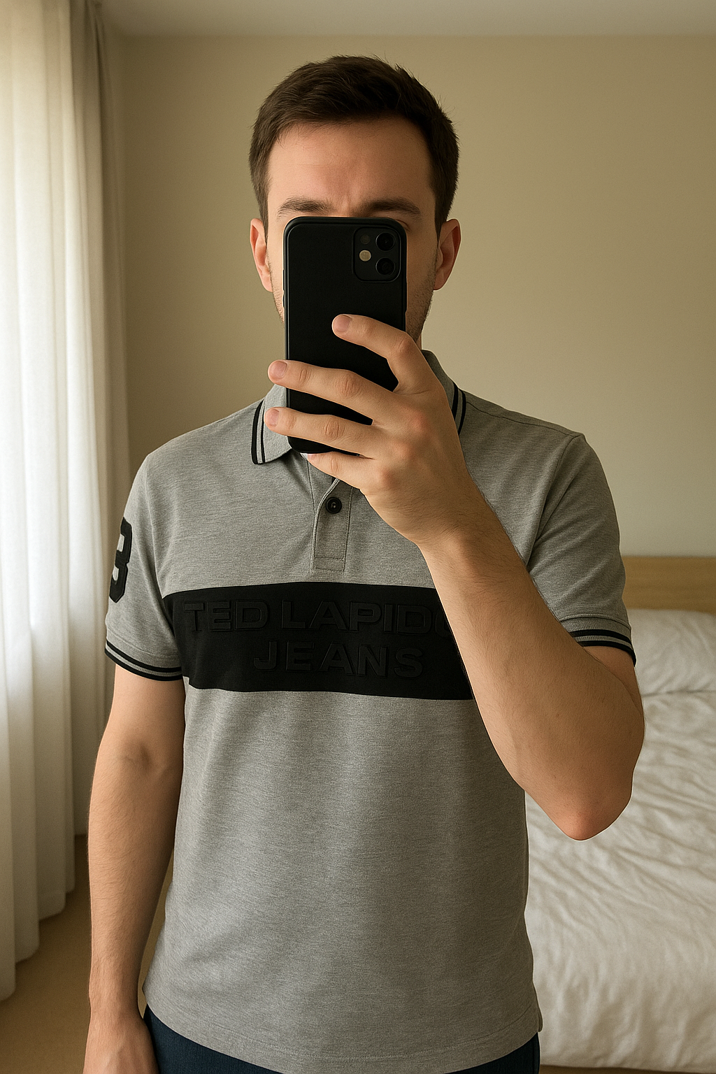 Polo Ted Lapidus debout, face à la caméra, dans une chambre à la lumière douce, avec une lumière naturelle filtrant par la fenêtre.