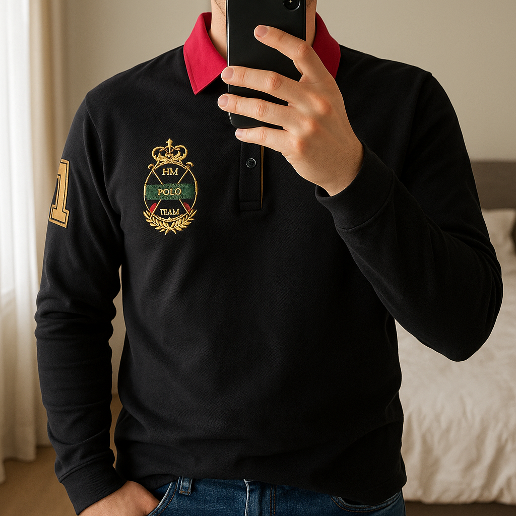 Polo Vintage Y2K Taille L Homme debout, face à la caméra, dans une chambre à la lumière douce, avec une lumière naturelle filtrant par la fenêtre.