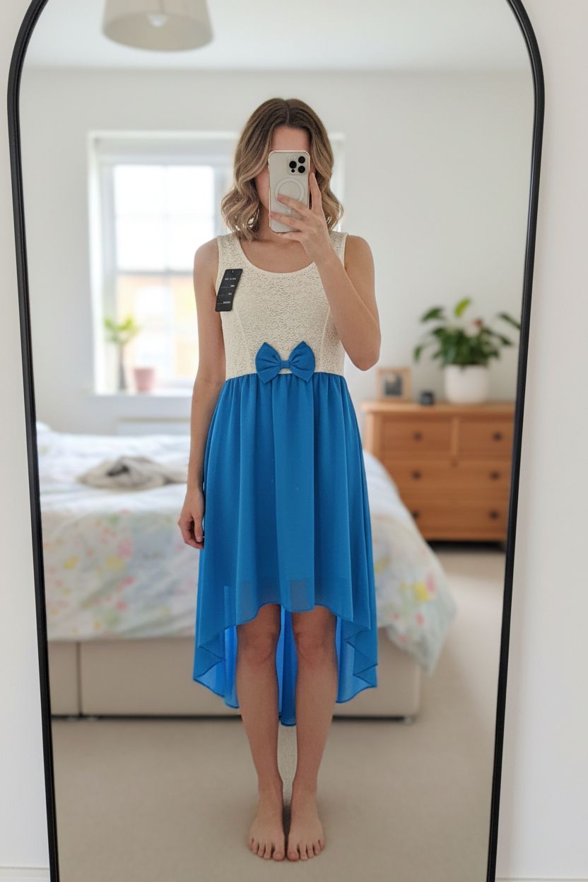 A person in Preppy Cream lace & blue bow midi Blair Warldolf core Babydoll style dress BNWT size M Vintage Y2K standing straight facing the camera, with a slim body type, in a softly lit bedroom setting, with gentle natural light filtering through a window.