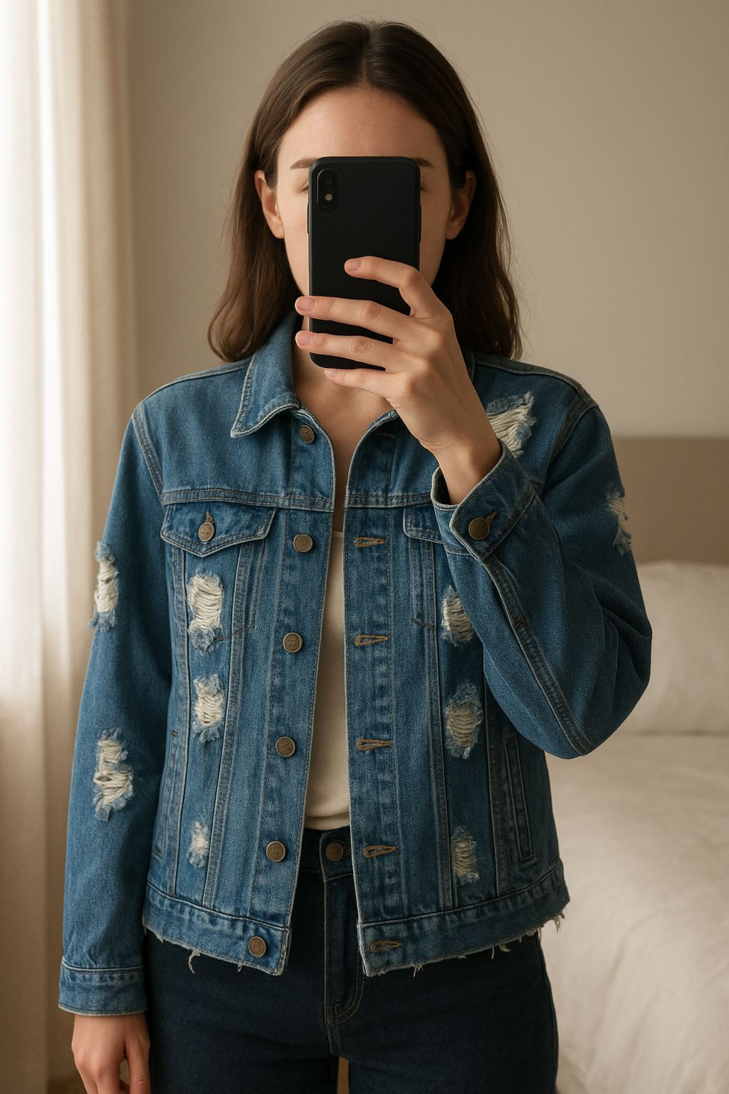 Prettylittlething distressed denim jacket standing straight facing the camera, in a softly lit bedroom setting, with gentle natural light filtering through a window.
