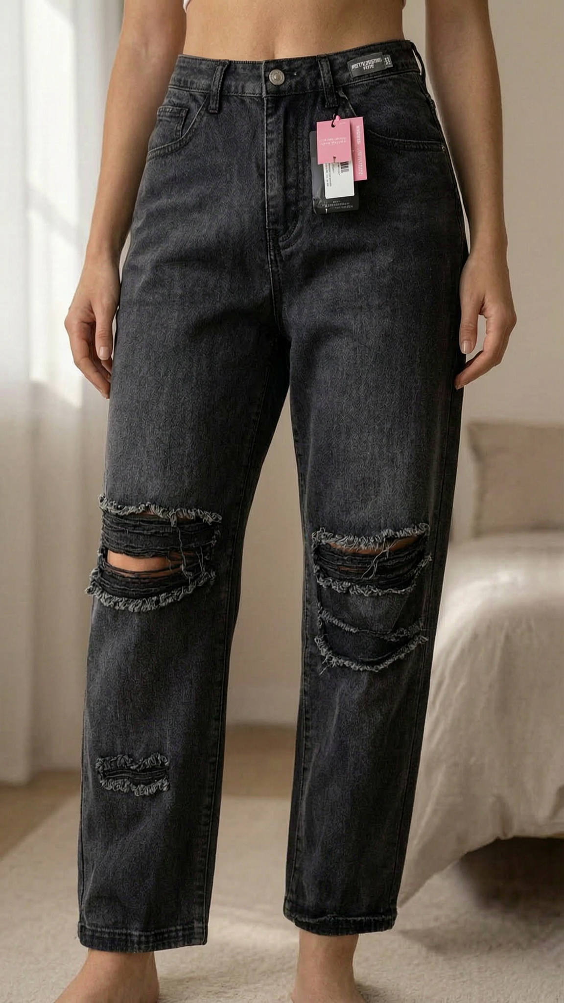 PrettyLittleThing Petite Black Baggy Low Rise Distressed Boyfriend Jeans – UK 6 | New With Tags standing straight facing the camera, in a softly lit bedroom setting, with gentle natural light filtering through a window.