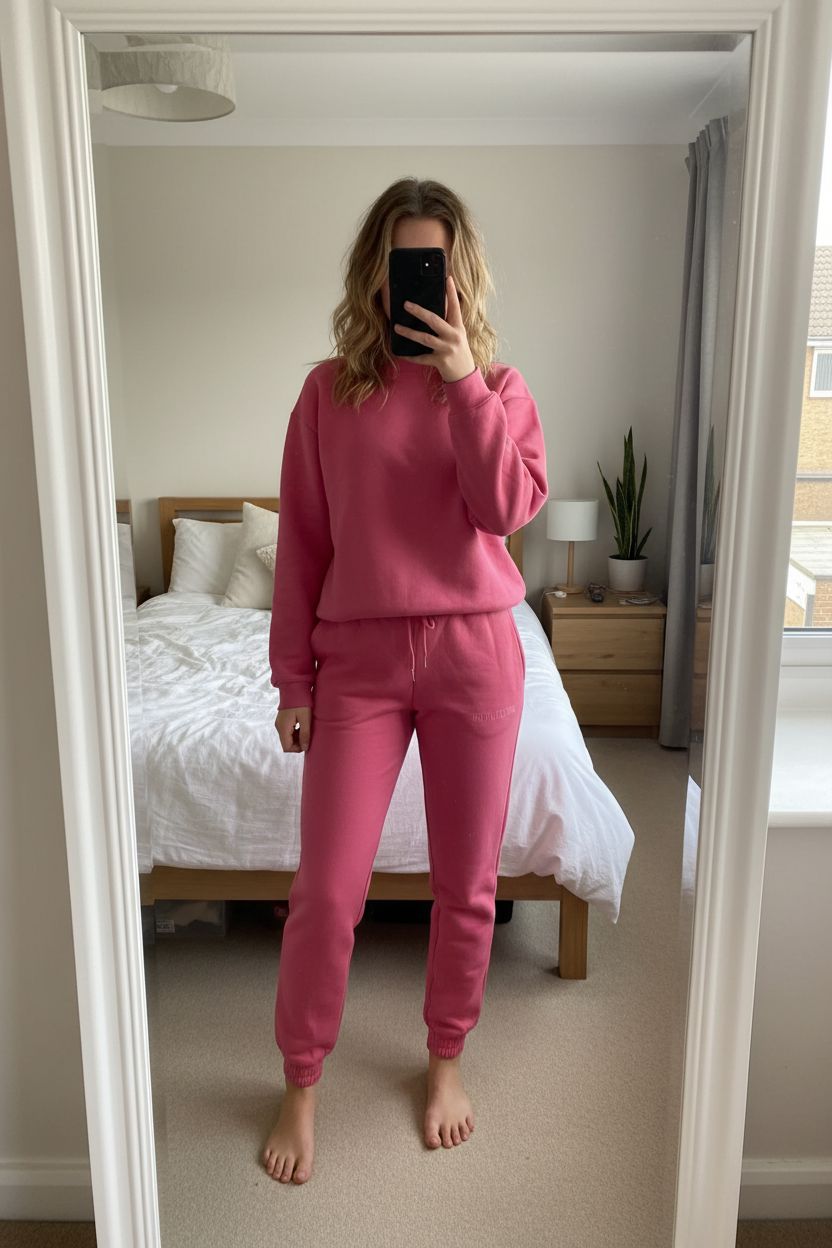 PrettyLittleThing Pink Tracksuit Set XS New Without Tags standing straight facing the camera, in a softly lit bedroom setting, with gentle natural light filtering through a window.