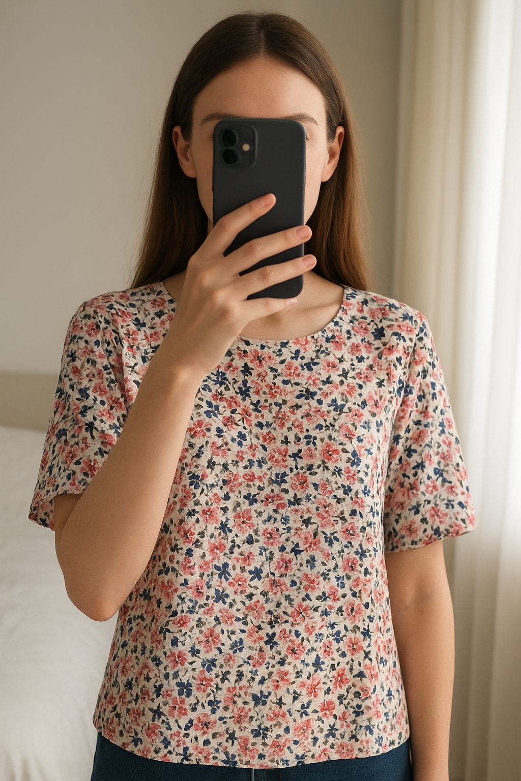 Primark floral blouse standing straight facing the camera, in a softly lit bedroom setting, with gentle natural light filtering through a window.