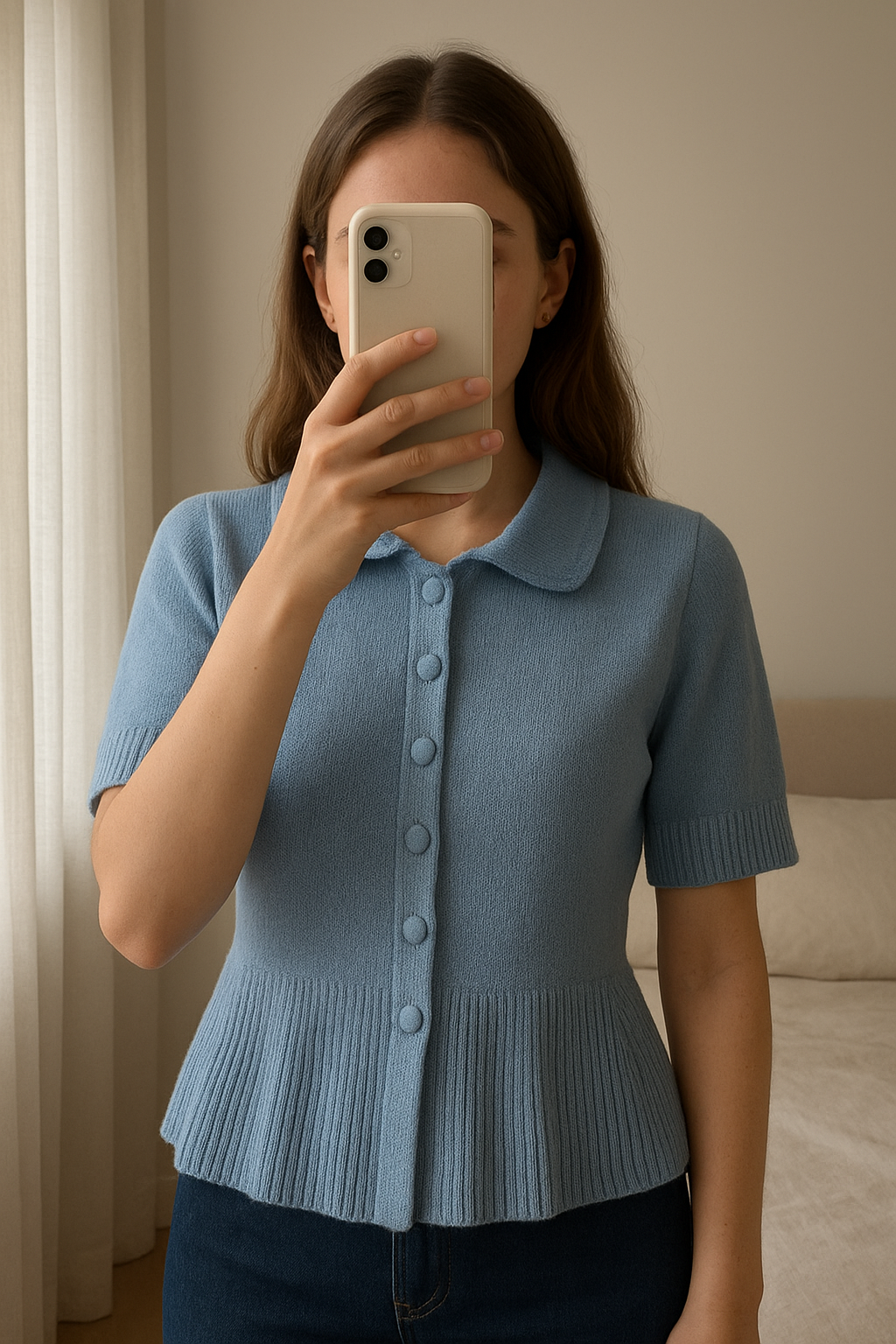 Primark Herbst knitted Cardigan size XL standing straight facing the camera, in a softly lit bedroom setting, with gentle natural light filtering through a window.