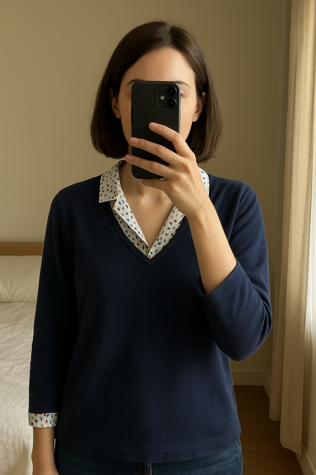 Pull Armand thiery debout, face à la caméra, dans une chambre à la lumière douce, avec une lumière naturelle filtrant par la fenêtre.