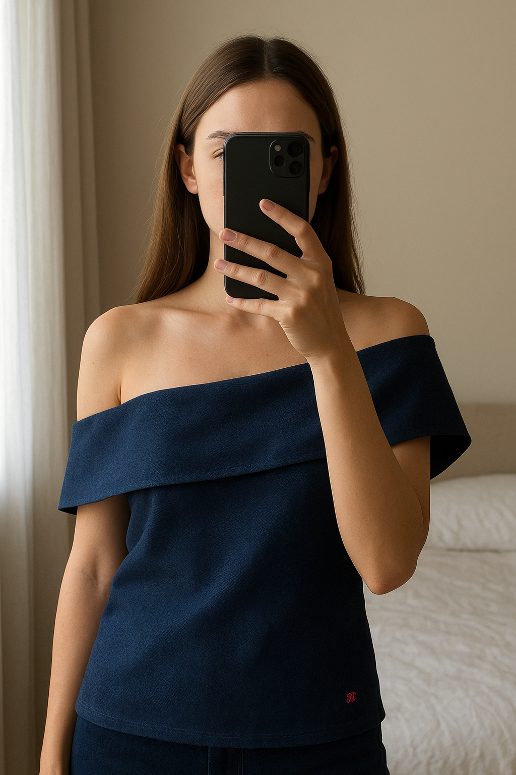 Pull & Bear Pacific Republic Navy Blue Top Stretchy Soft Denim Size Medium M standing straight facing the camera, in a softly lit bedroom setting, with gentle natural light filtering through a window.