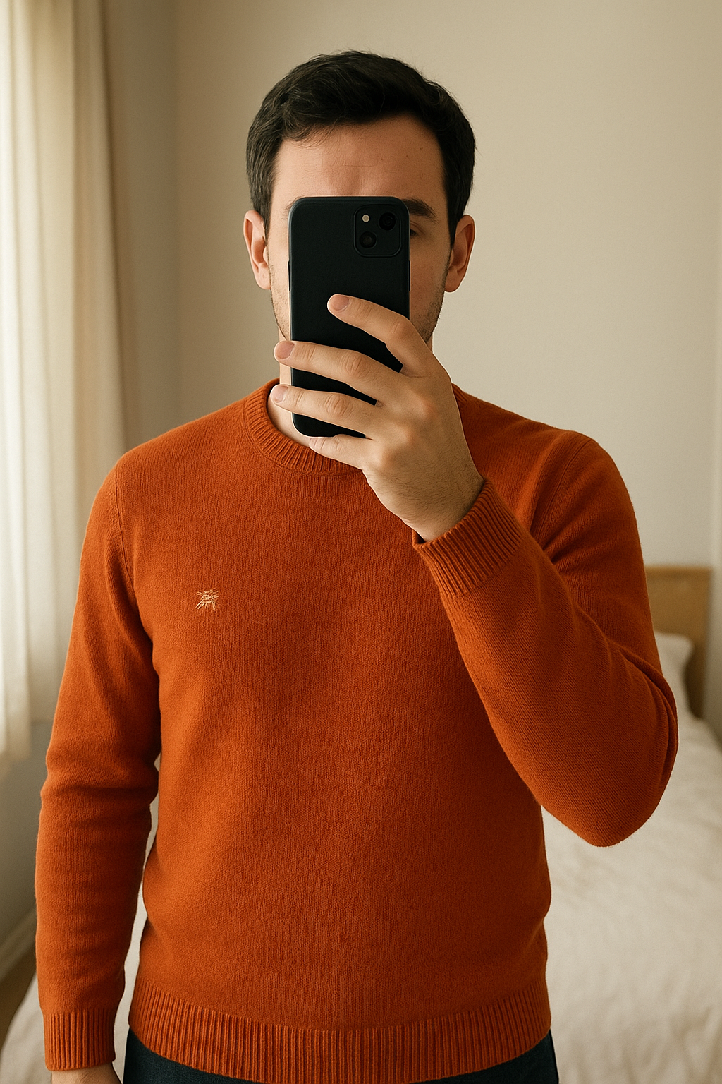 Pull Burberry London Laine / Angora logo brodé orange - Homme - orange taille XXL - très bel état debout, face à la caméra, dans une chambre à la lumière douce, avec une lumière naturelle filtrant par la fenêtre.