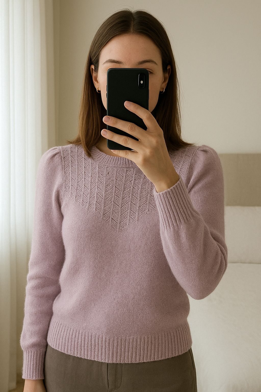 Pull Cache Cache - Mauve debout, face à la caméra, dans une chambre à la lumière douce, avec une lumière naturelle filtrant par la fenêtre.