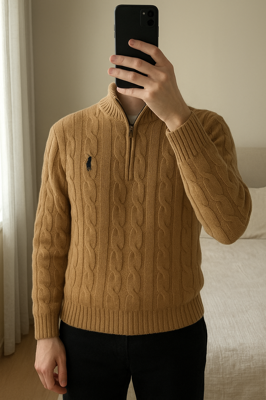 Pull camel Ralph Lauren taille XL debout, face à la caméra, dans une chambre à la lumière douce, avec une lumière naturelle filtrant par la fenêtre.