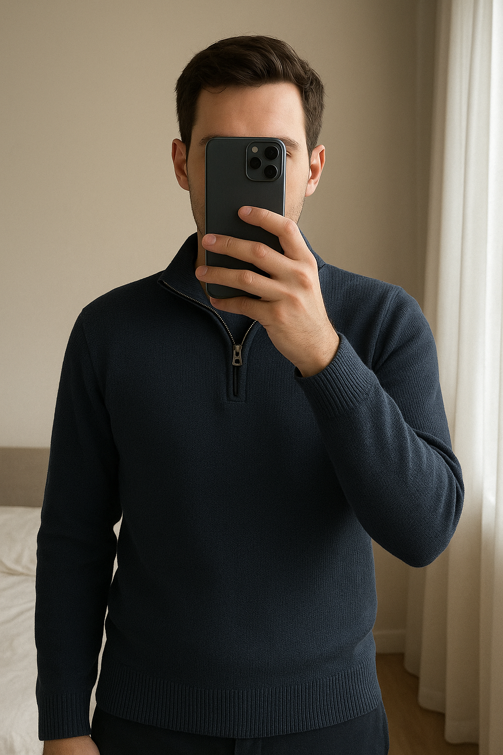 Pull Cammioneur Halfzip Tommy Hilfiger 100% Coton Bleu Marine XL debout, face à la caméra, dans une chambre à la lumière douce, avec une lumière naturelle filtrant par la fenêtre.