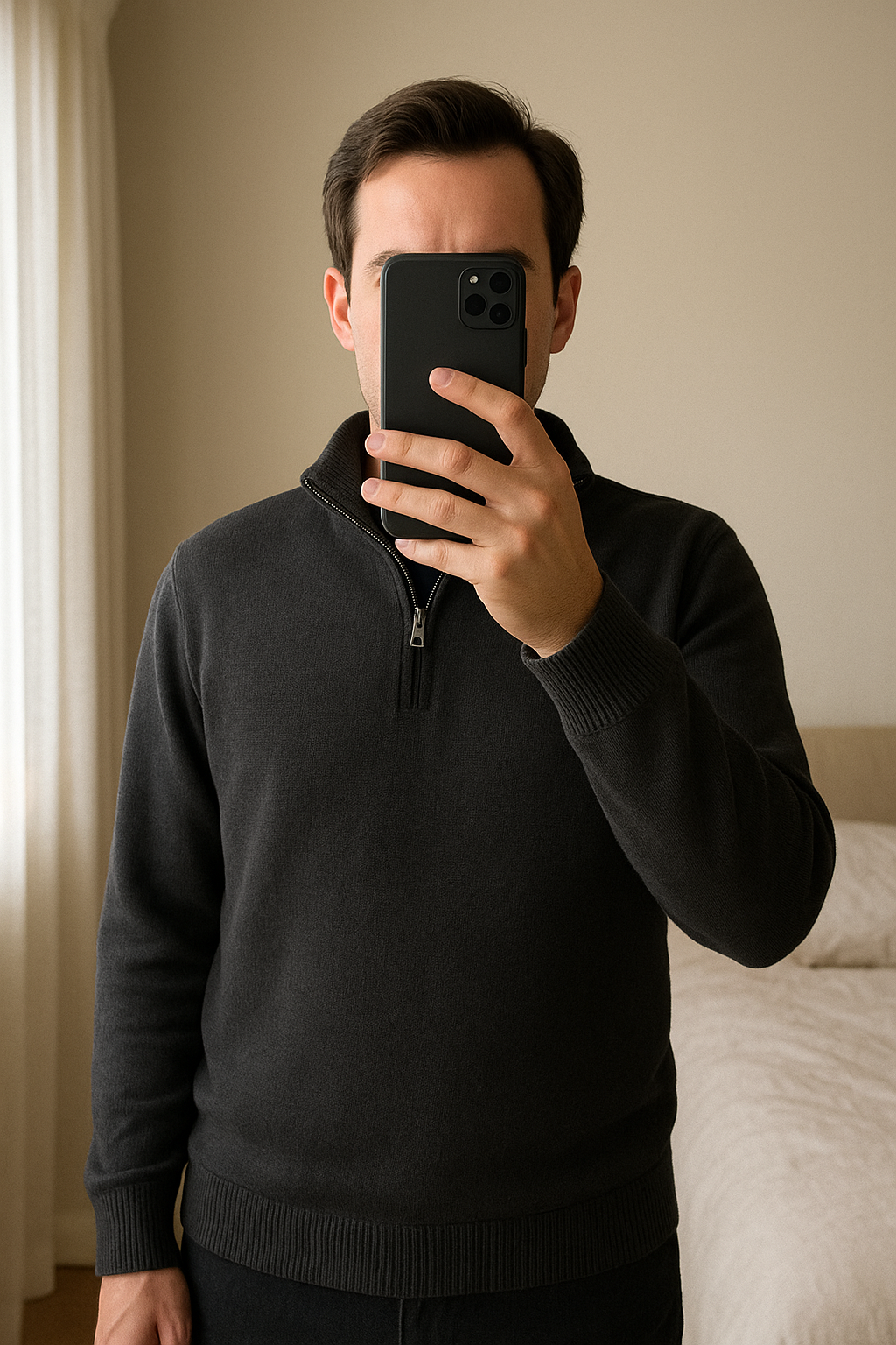 Pull Cammioneur Halfzip Tommy Hilfiger 100% Coton Noir XXL debout, face à la caméra, dans une chambre à la lumière douce, avec une lumière naturelle filtrant par la fenêtre.