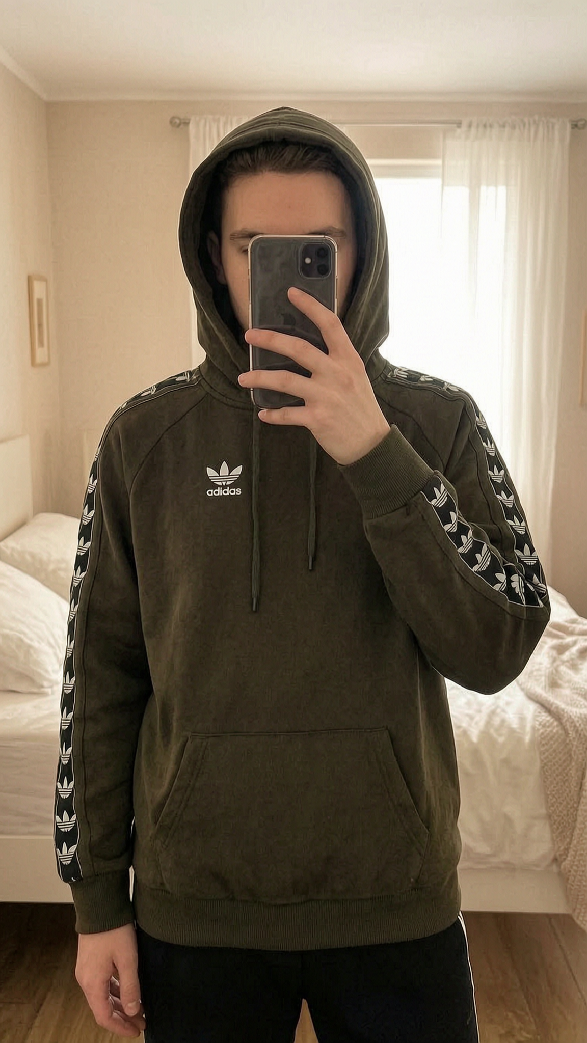Pull capuche adidas debout, face à la caméra, dans une chambre à la lumière douce, avec une lumière naturelle filtrant par la fenêtre.